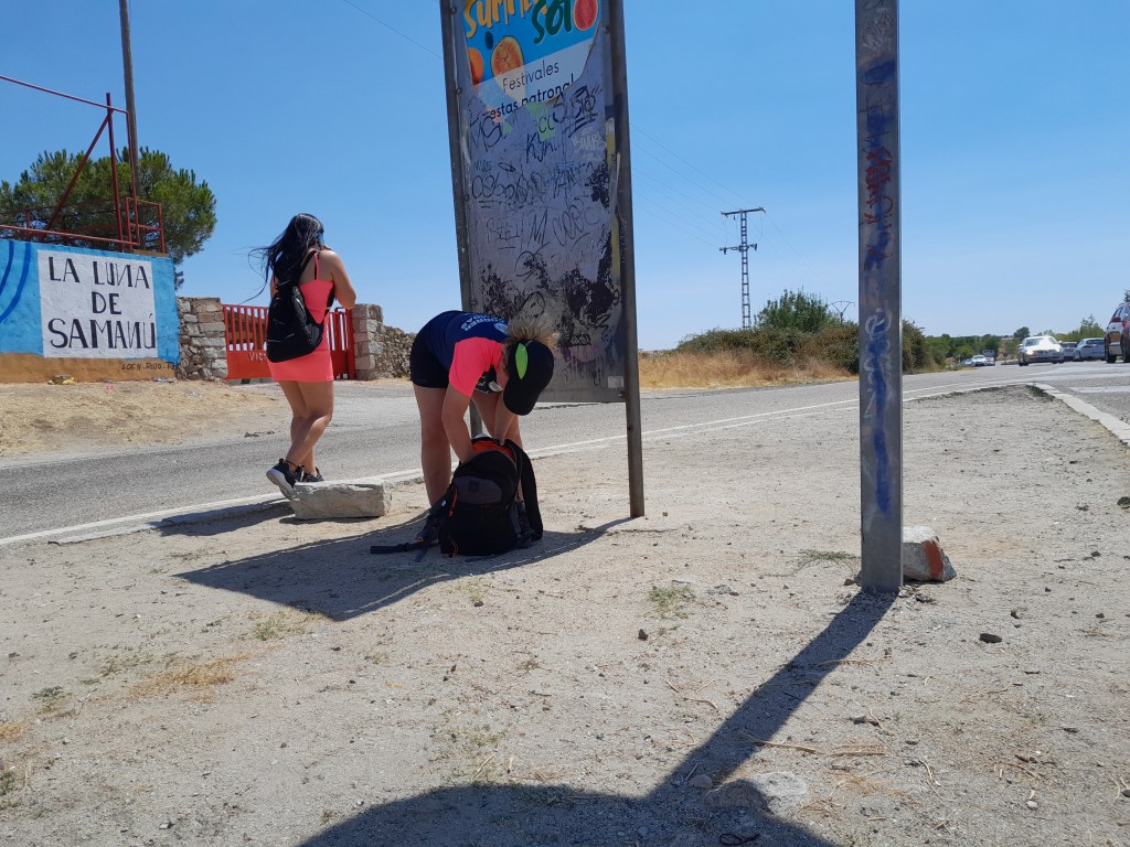 In Manzanares schieten we na een dikke 17 kilometer in drie uur meteen het terras op voor nog een koud drankje. We gaan niet langs huis – waarom denk ik nu aan Monopolie – maar vinden een bus die ons weer verder brengt naar een plek waar een andere bus ons naar Miraflores de la Sierra brengt. De hitte bij de bushaltes is ondraaglijk en Susannah gaat misselijk op de grond zitten. In de bus is het 34 graden. We zijn blij als we eindelijk in Miraflores zijn. Daar moeten we liftend de bergpas op naar de auto.