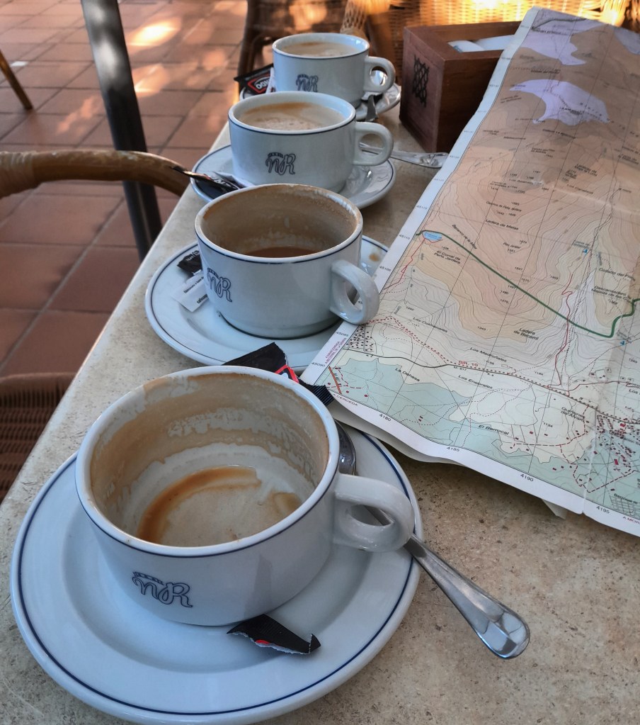 Je kan dan ook niet anders dan heerlijk rustig starten in skioord Navacerrada met twee heerlijke bakken café con leche op het terras voor de casa rurale. Naast de koffie draperen we de kaart over tafel, koffie en plannen.