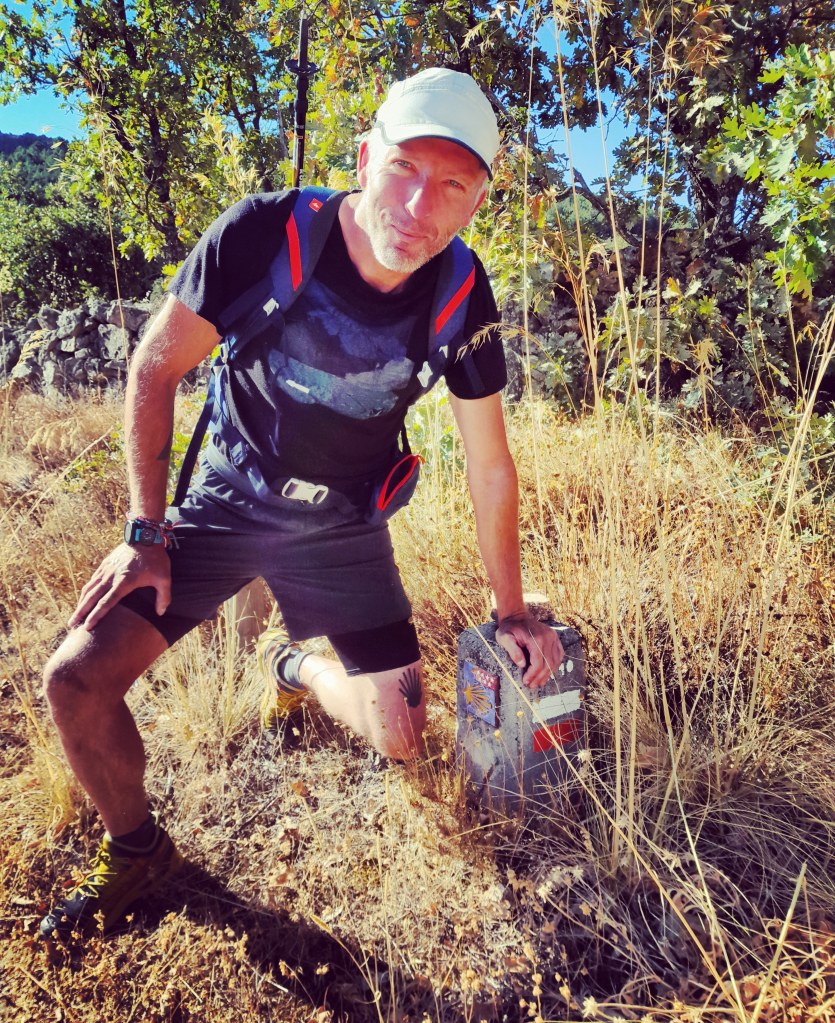 We hebben er flink de pas in en blijken een mooie single track door het bos te hebben. Voor de zoveelste dag is het bloedje heet en ik realiseer me dat ik al dagen nauwelijks hoefde te toiletteren tijdens het lopen ondanks veel drinken. Nog meer drinken dus.