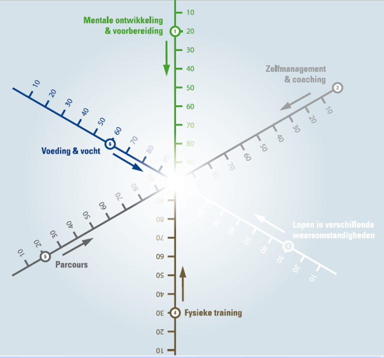Competenties: 1. Mentale training, 2. Fysieke training, 3. Lopen in verschillende weersomstandigheden, 4. Voeding, vocht en gezondheid en 5. zijn route.