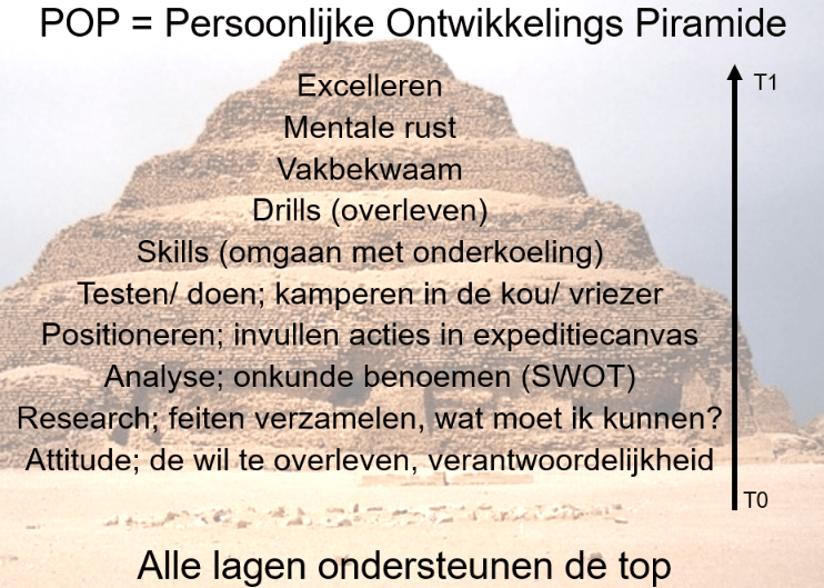 Zo heb ik eens met minus 30 op het poolijs gezeten waarbij mijn hele uitrusting uit elkaar viel. Stijgvellen plakten niet meer, communicatieapparatuur stopte met werken en de branders functioneerden niet goed meer. Uiteindelijk hebben we de batterijen van de satelliettelefoon au bain-marie zitten verwarmen om enkele seconden contact te maken en een teken van leven te kunnen geven. Als alles tegenzit, moet je de mentale rust hebben om op dat moment flexibel te improviseren. Hoe kom je daar? Ik vlieg mijn expedities aan door een persoonlijke ontwikkelings piramide te doorlopen.