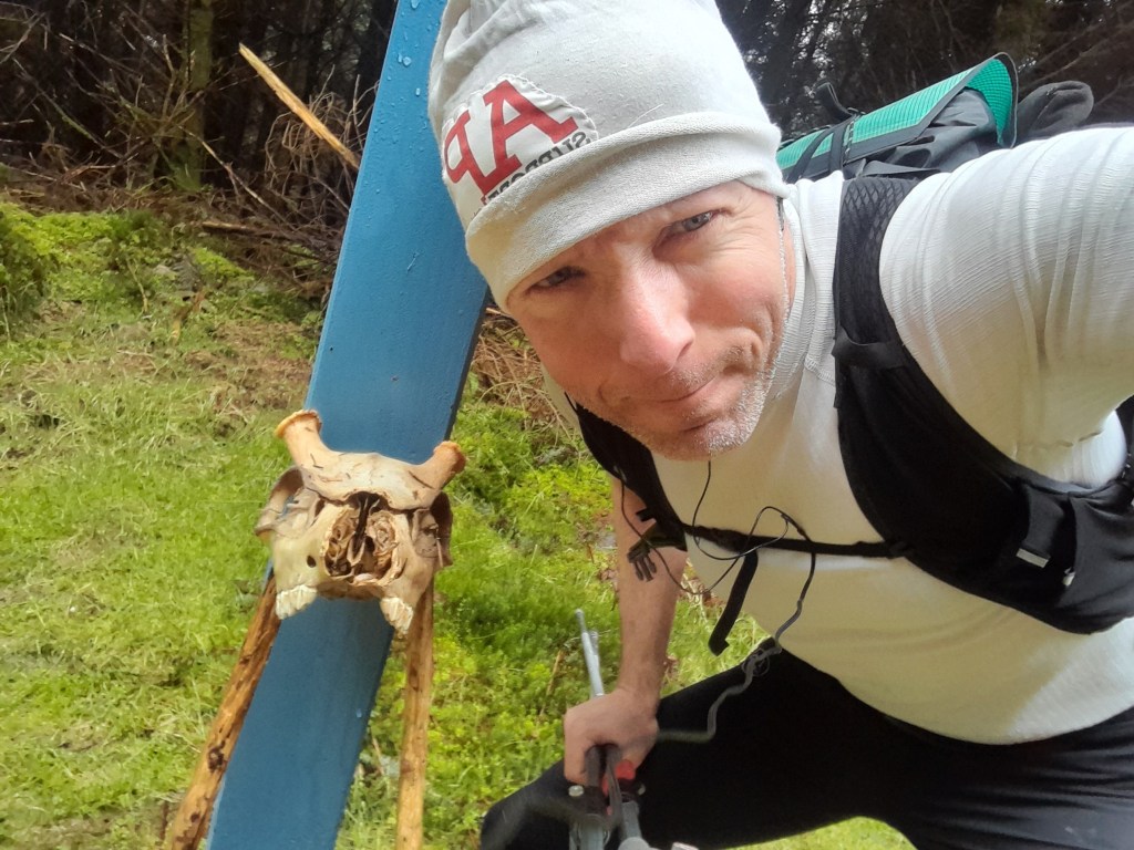 Niet veel later ben ik er al voorbij en knal ik rechts via een single track het bos in. De splitsing is gemarkeerd met een bord. Daartegen twee stokken met een schedel erop. Morbide aanblik, Schotse humor. En doorrr…