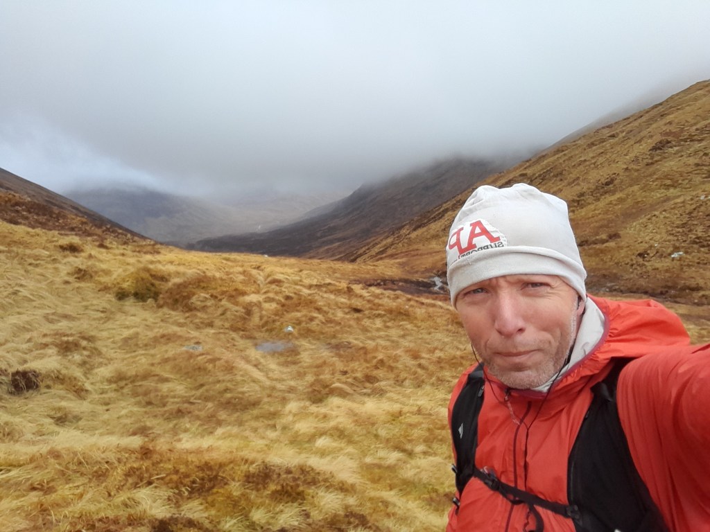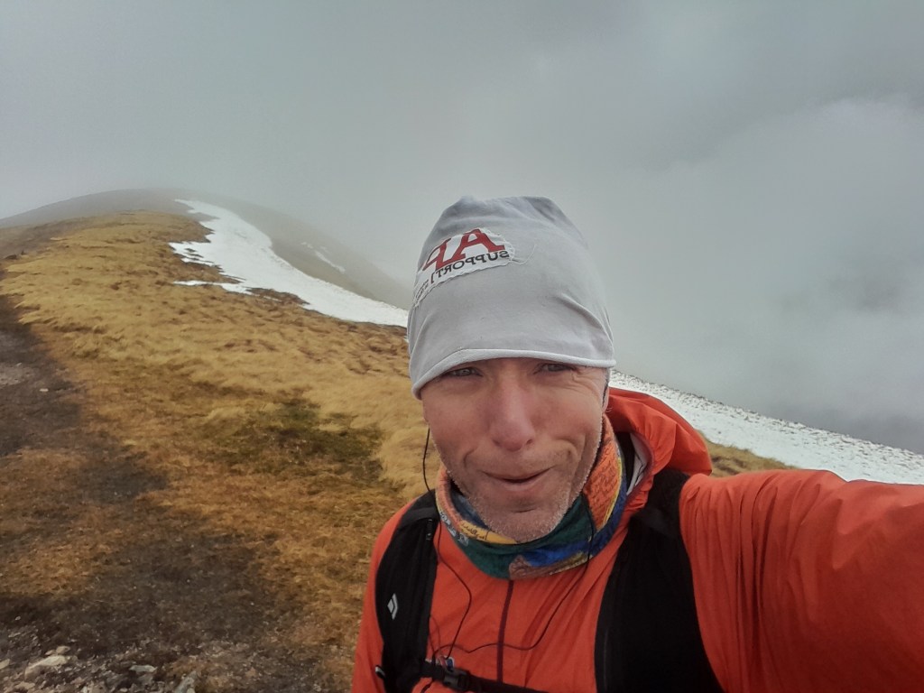 Vandaag is het weer beter dus ik maak bij de cairn een topfoto met de Schotse vlag die Jenny voor me gemaakt heeft evenals de topvlag van de NKBV. Toch waait het flink en ik besluit vanavond met een ragfijn koord beide vlaggen aan elkaar te verbinden en dan het koord aan de trailrunrugzak te knopen. Zo hoef ik de vlaggen nooit meer te zoeken, met koude vingers tot gevolg en ze kunnen niet wegwaaien. Gaandeweg ontstaan je routines. Tenslotte maak ik een filmpje voor vriend Alexander. Hij steunde me in september toen ik 1.001k ging rennen maar niet kon starten vanwege een kaakonsteking. Hij kocht een zweetkilometer en daarom heb ik deze berg aan heb opgedragen.