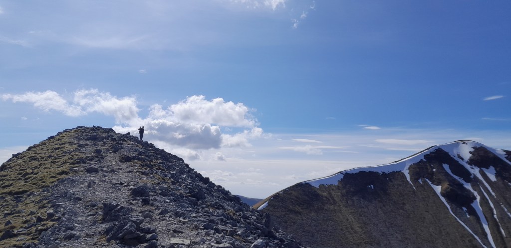 Een dame blijkt Nederlands en geëmigreerd naar Ierland voor haar vriend. Wat een toeval!, brult eenieder, maar we zijn het wel met elkaar eens datje overal gekke Hollanders vindt. We kletsen een kwartiertje en haar groep blijkt een Iers wandel- en klimgezelschap. Er zit een dame van 73 bij die voorin meedraait. Als de vraag wordt gesteld: moeilijke of makkelijke route?, is zij de eerste die al op de moeilijke variant zit. Ze hebben ontzettend veel lol en we delen chips, repen en water. Ondertussen genieten we van de magnifieke vergezichten. Helemaal rondom alleen maar imposante toppen zo ver het oog reikt. We kunnen het eiland Mul zien waar één eenzame Munro ligt, evenals de Cuillin ridge op Skye.