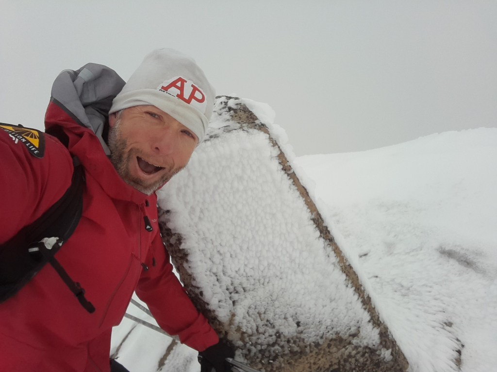 Het is verstand op nul en me omhoog werken naar de ridge op zoek naar de top. Inmiddels loop ik enkeldiep in natte sneeuw en begint het plonzen wat af te nemen. Ik hang tegen de wolken aan en zie slierten met wolk langsdrijven op de wind.