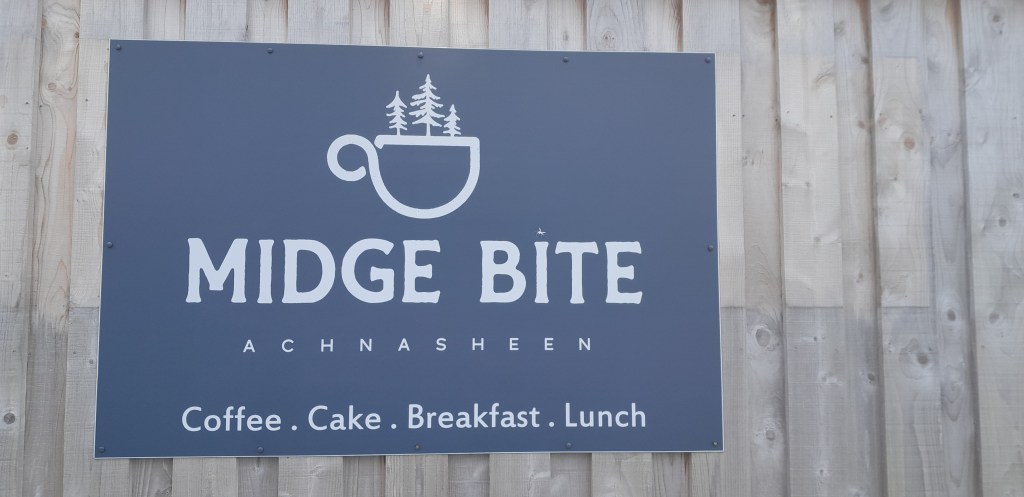 Beneden een stuk langs de weg naar het koffietentje met de toepasselijke naam Midge Bite. Het is er aangenaam warm en twee flinke koppen koffie smaken als balsem voor de verkleumde ziel.