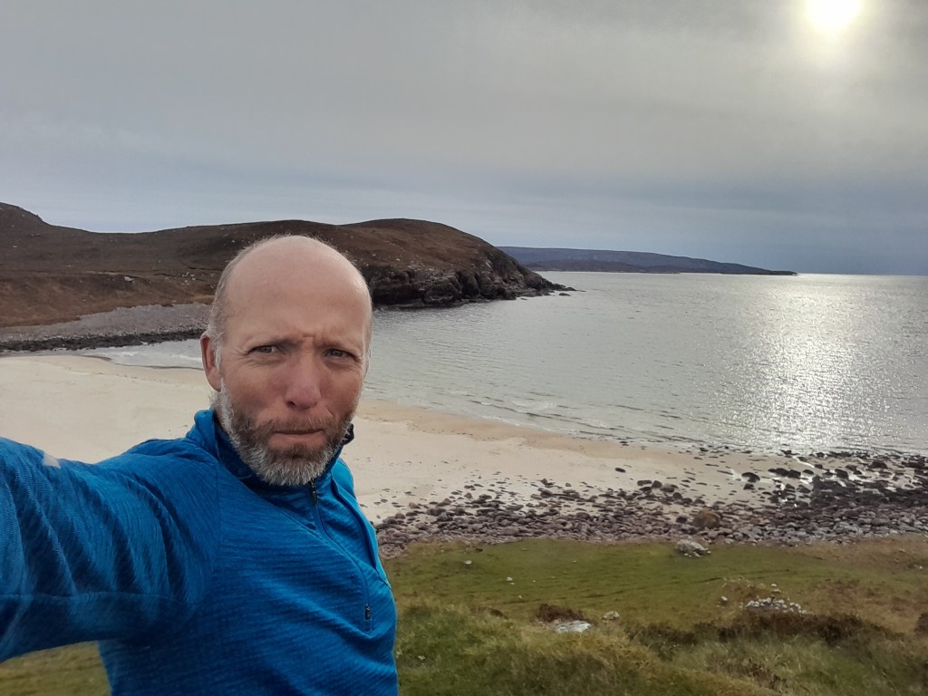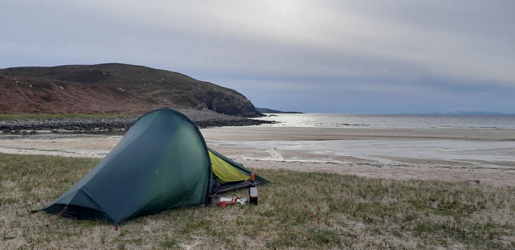 Dan zet Kevin me af aan de andere kant van de landtong. Ik kan een track van vijf kilometer volgen en kom dan uit in een verlaten baai met een wit zandstrand waar ik kan overnachten, Slaggan Bay. Hoe verder ik de track afloop, hoe meer ik begin te glunderen. Dit is met recht een baai in the middle of nowhere. Munro’s zijn prioriteit één, maar dit is met recht een kampeerplek die tot de mooisten op mijn lijstje hoort. Ik deel mijn baai met tien schapen die ongestoord doorgrazen. Het is doodstil en alleen het geruis van de kleine golfjes die op het strand stukslaan, doorbreekt de stilte. Ik wil meteen allemaal fijne foto’s maken voor mijn partners, en filmen, en de baai verkennen, en.. en.. en…