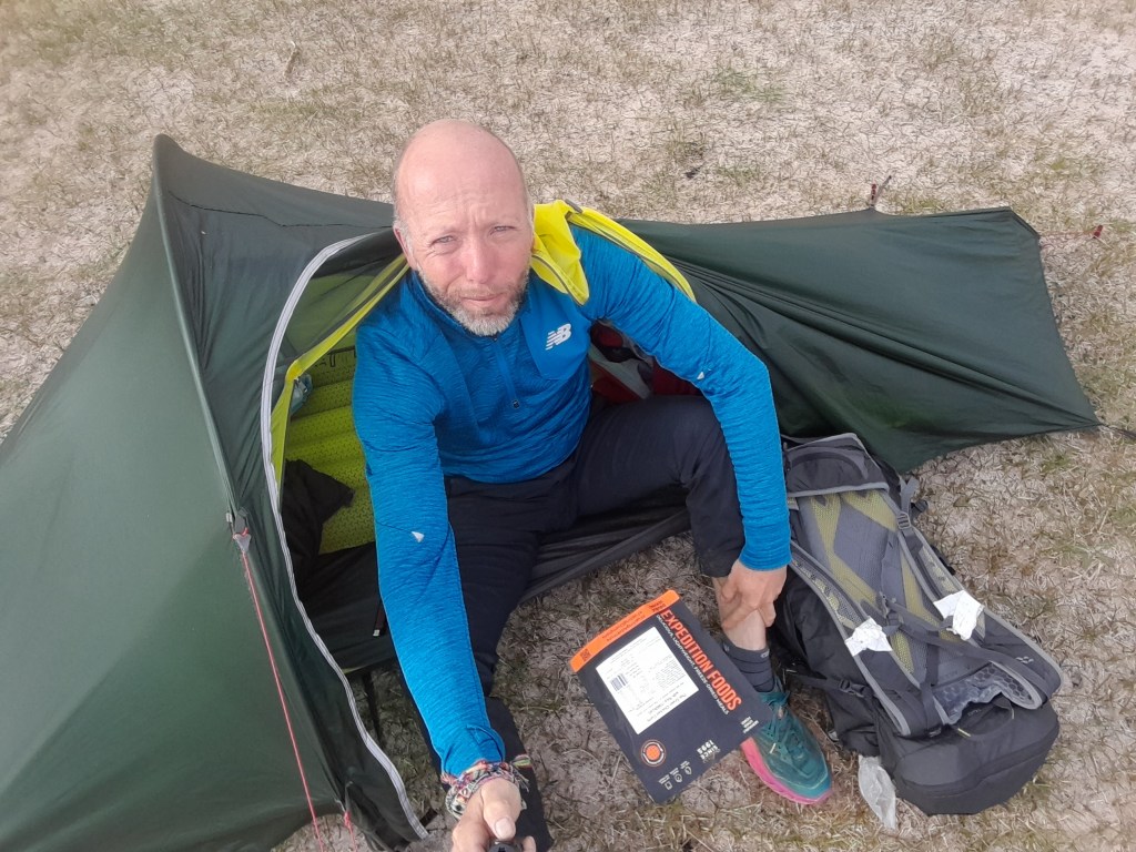 Na een overnachting op misschien wel de mooiste kampeerplek in mijn leven, gaat datzelfde leven door. Ik wurm me uit mijn slaapzak en start de brander. Ik heb net genoeg water om een expeditiemaaltijd van Expedition Foods te maken. Mijn dag start met Green Thai Curry.