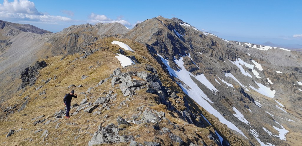 Ik tik mijn topje aan en baan me behendig een weg naar beneden. Wat volgt, is een immense klim via een afbollende kam die maar niet lijkt te eindigen. Steeds als ik denk dat ik er ben, volgt weer een golf van grasland die zich verder voor me uitstrekt. Uiteindelijk doemt in de verte een cairn op. Vanaf hier kan ik de hele graat overzien die we vandaag traverseren. Paul en Peter zijn drie kleine topjes verder en zwaaien.