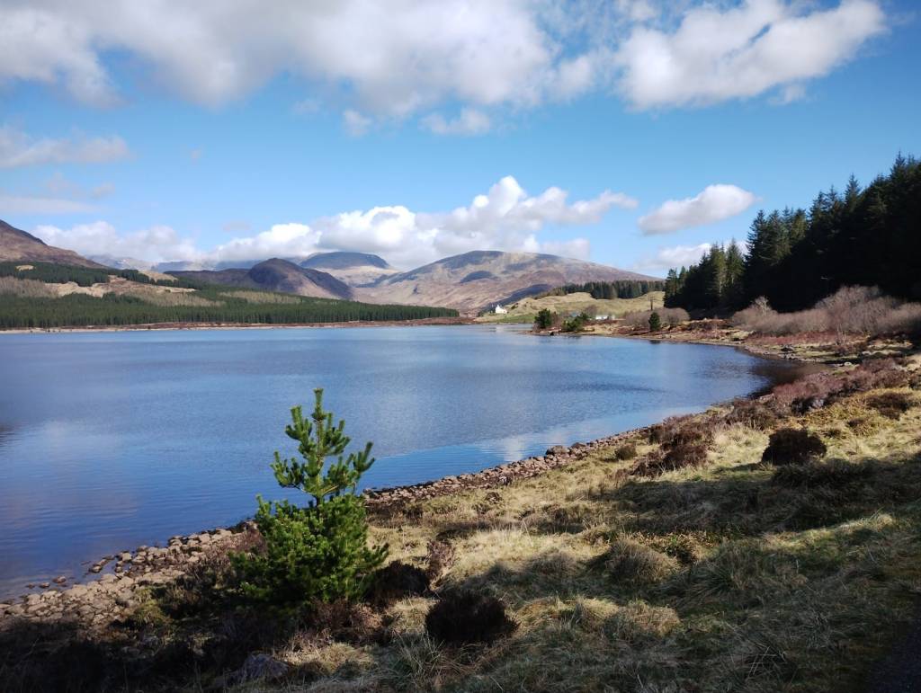 De aanloop is prachtig. We passeren Loch Ailsh met daarachter onze bergketen en op de oever een statig wit pand, de Ben More Lodge. Het water is spiegelglad en onze Ben More weerspiegelt prachtig. Paul vertelt dat in de lente het ijs van de meer zich met veel krakend geweld achter zijn huis langs door de rivier een weg baant. Soms stagneert de ijsstroom bij bruggen en krijg je indrukwekkende ijsophopingen.