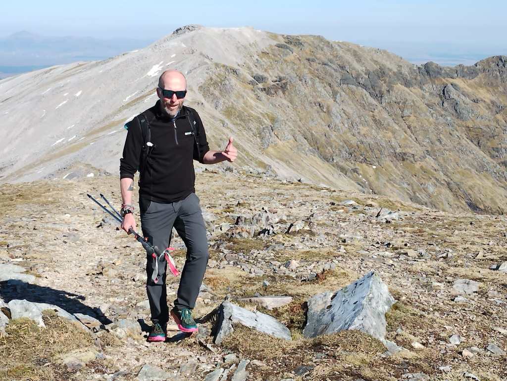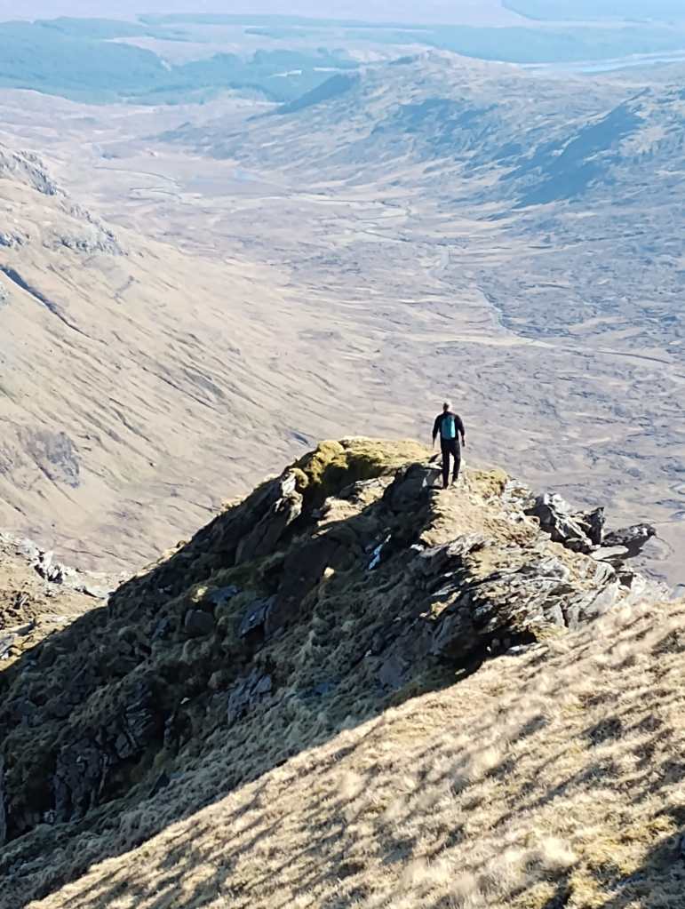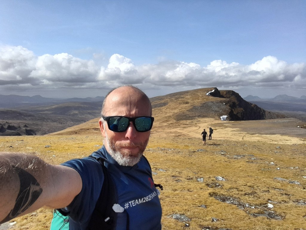 De mannen zitten in een klein zadel te praten met twee andere klimmers die van de andere kant komen, een Ier en een Engelsman. Vooral de twee Ieren kunnen het qua humor meteen met elkaar vinden. Ik mag het mikpunt zijn. Peter vertelt dat ik de snelste Nederlandse Compleator wil worden waarop de ander adrem reageert: ‘What the fuck are you doing, sitting down?’ en meteen daarna ‘Just saw a wee girl from Eindhoven running past’. Nu is het hek van de dam. Peter: ‘It is his Tinderdate’. Ier: ‘Are you Jan the rapist?’ Paul gaat ook meedoen: ‘Just looked at your website and it said solo runner. Well you fucked that!’ Later op de dag appt Peter nog met een vriend: ‘Climbing some remote Munro’s… Met Jan a few days ago.. he is a professional adventurer, ultra runner, and aiming to do all 282 Munro’s in 4 months. I am doing my best to slow him down and thwart his dreams.’