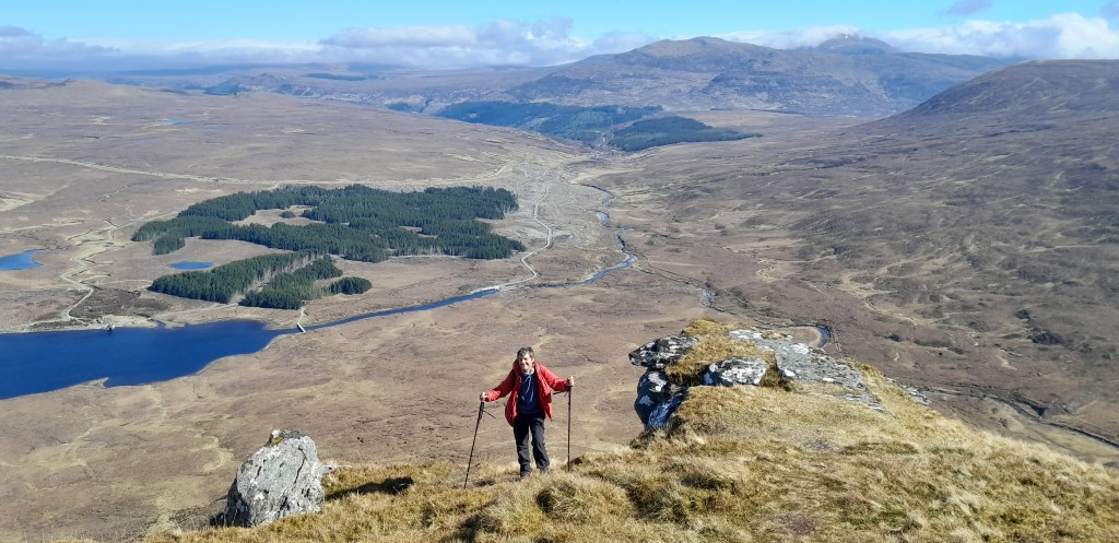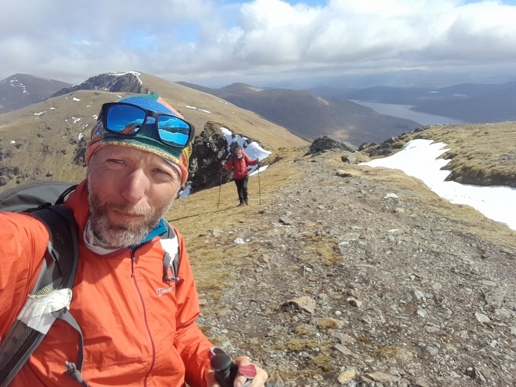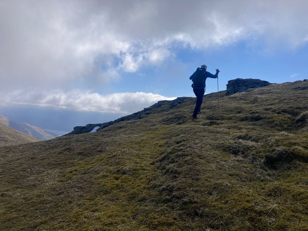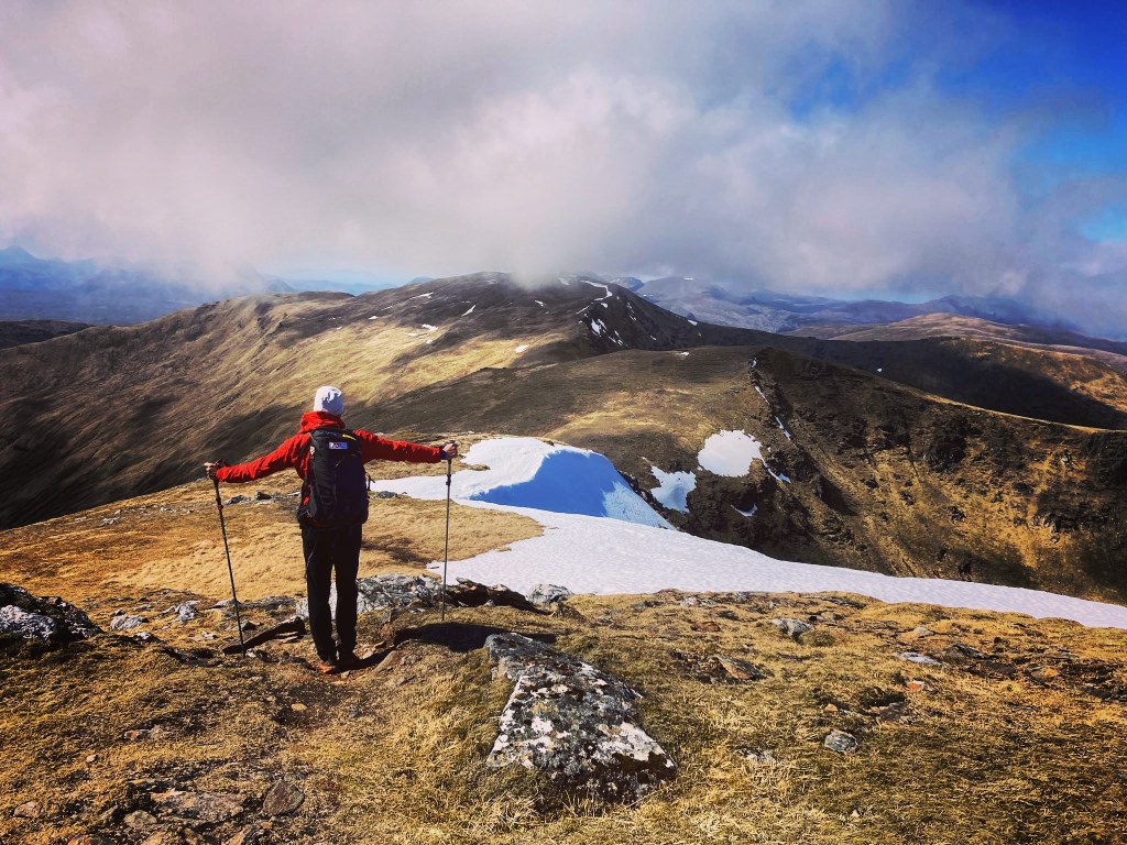 Deze dag is de tegenpool van gisteren. Het terrein is heerlijk, de berg afwisselend en het weer spectaculair. Wolken suizen voorbij alsof we in het vliegtuig zitten. De hele dag jasje-aan-jasje-uit. We dalen de top af, klimmen een stuk naar een tussentop, dalen weer af naar het zadel en klimmen weer naar Munro twee. Prachtige vergezichten op de Cape Wrath Trail die Matt liep en Slioch waar ik dagen onder kampeerde. Ik draag de top op aan Elly die me volgt en heerlijk warme mutsen voor me breit. Dank, lieve Elly, het houdt de kale kop warm.