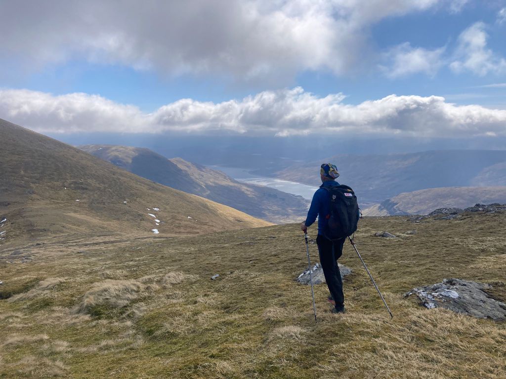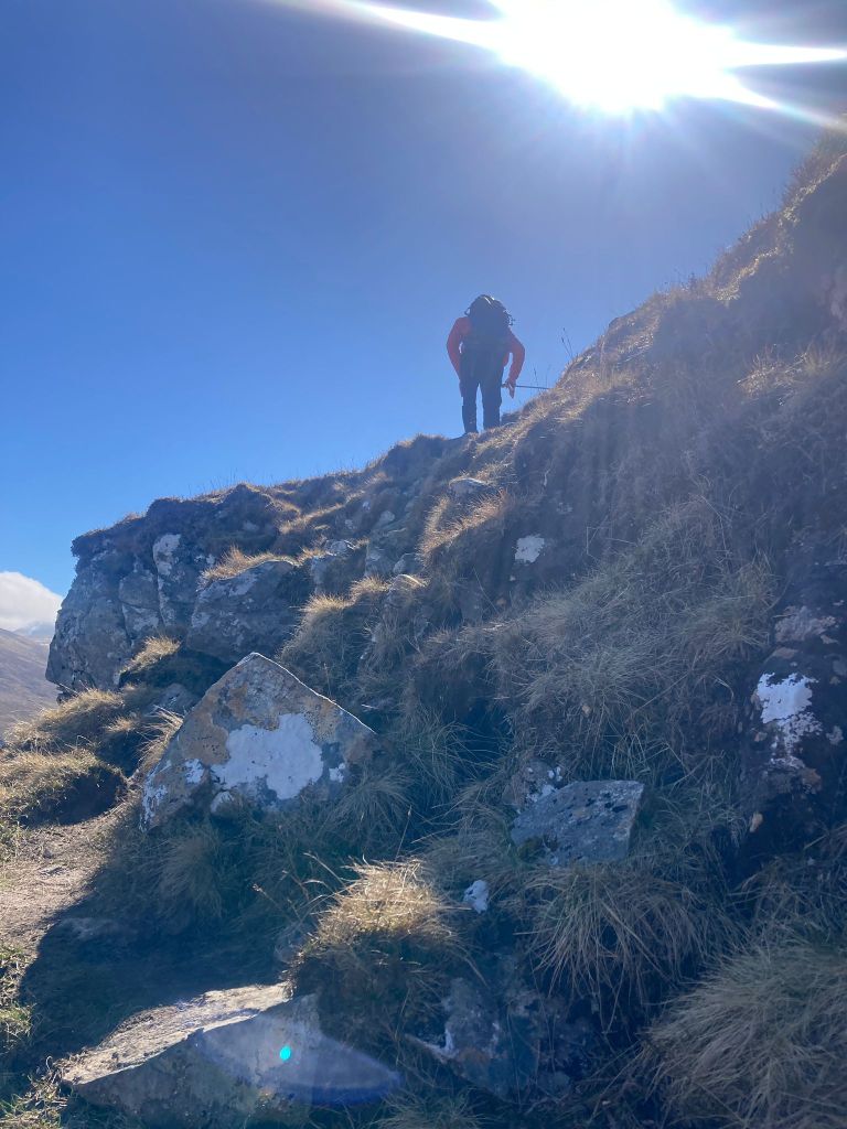 We halen de groep uit Glasgow in en trekken meteen vanuit het zadel door naar onze eerste top. Matt wordt steeds uitzinniger en rent bijna als een kwispelende puppy voor me uit terwijl ik hem film. Hij is zichtbaar euforisch en appt meteen zijn vrienden. Ik draag de berg op aan Coby, de buurvrouw van mijn vader van in de negentig die me trouw volgt.