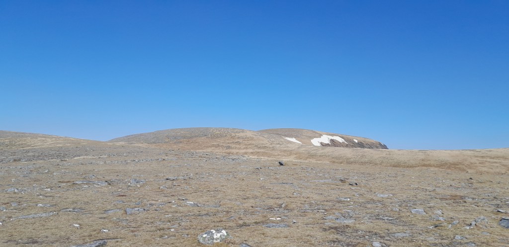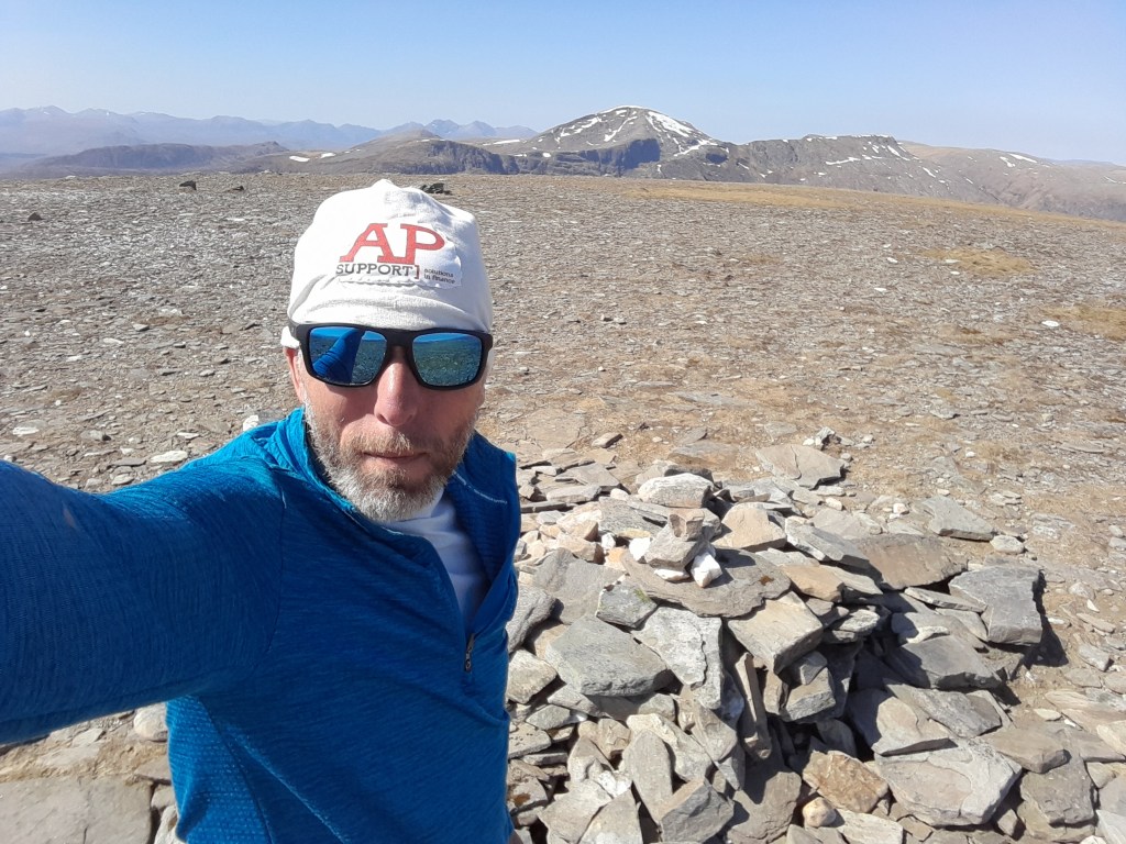 De berg van vandaag is saaier dan de eerdere ondanks zijn sprankelende naam. Eenmaal op de heuvelrug sla ik linksaf waarna een lange halvemaan-vormige tocht volgt die via enkele voortoppen naar de hoofdtop leidt. Een andere kerel staat foto’s te nemen bij de cairn en als ik aankom, kreunt hij: That was a rather long plod.