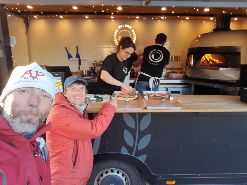 We eindigen de dag met onze houtovenpizza. Het is moordend druk bij de wagen en we hebben de laatste twee pizza’s voordat het deeg op is. We doen de kerel de groeten van zijn stiefvader, hilariteit alom.