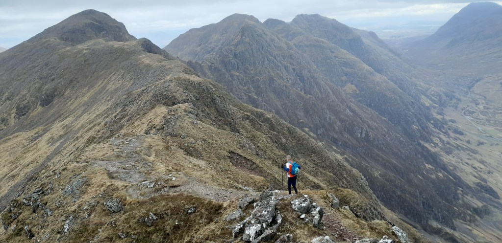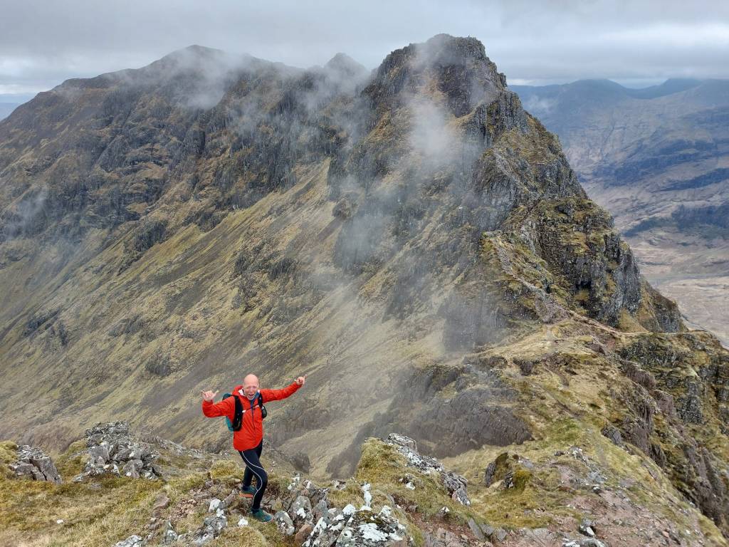 Na een full breakfast van onze eetkar en een emmer koffie zijn we er relatief vroeg bij. We vertrekken rennend vanaf de camping want de graat ligt recht boven ons. De klokjes gaan aan en het gas erop. We kunnen vanaf de Clachaig Inn via een ribbe omhoog maar dat wordt afgeraden. Hij is zo steil dat je snel wegglijdt en naar beneden kegelt. Met name als je van de andere kant komt, bestaat de verleiding deze route te pakken en rechtstreeks naar de pub af te dalen, maar dat kan dus wel eens je laatste afdaling zijn.
