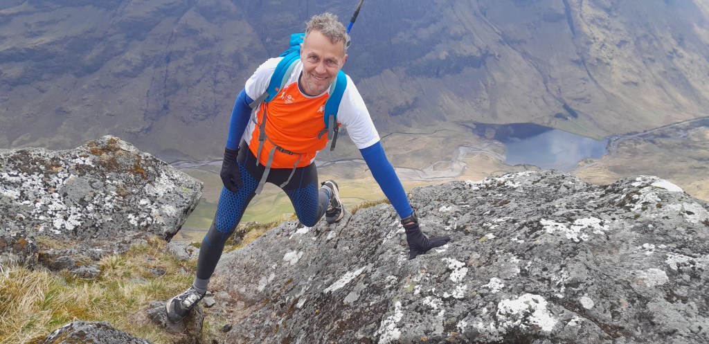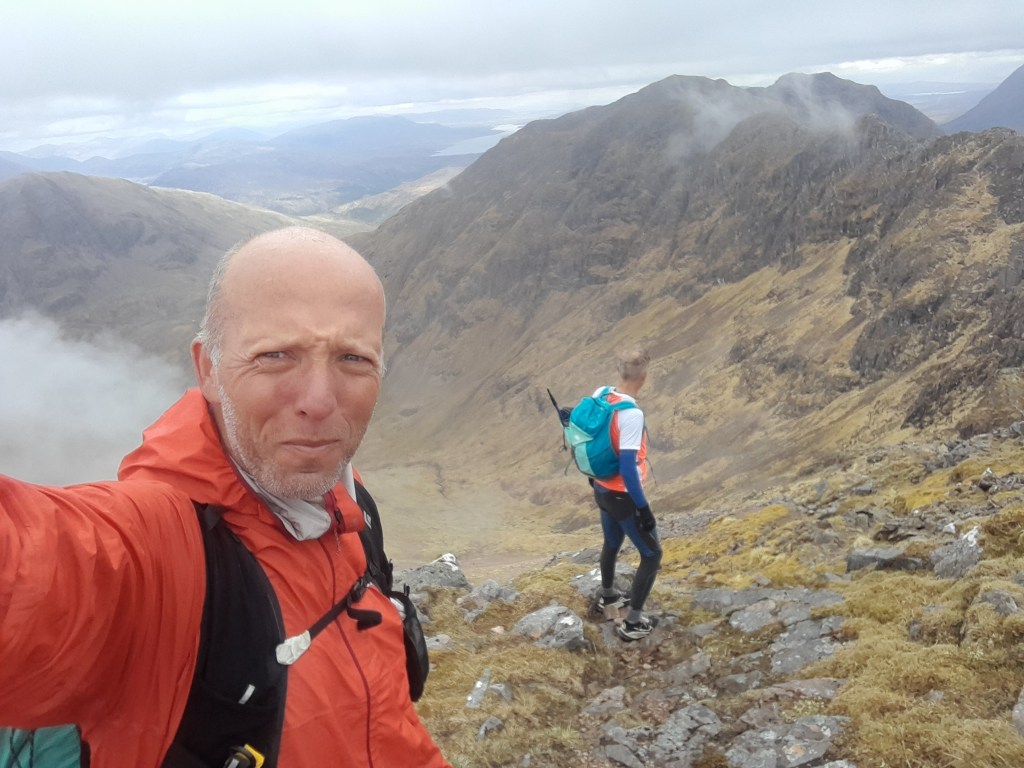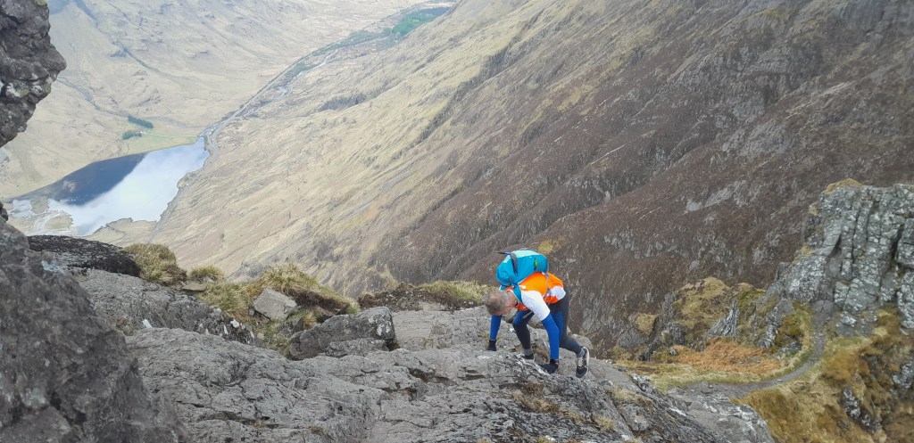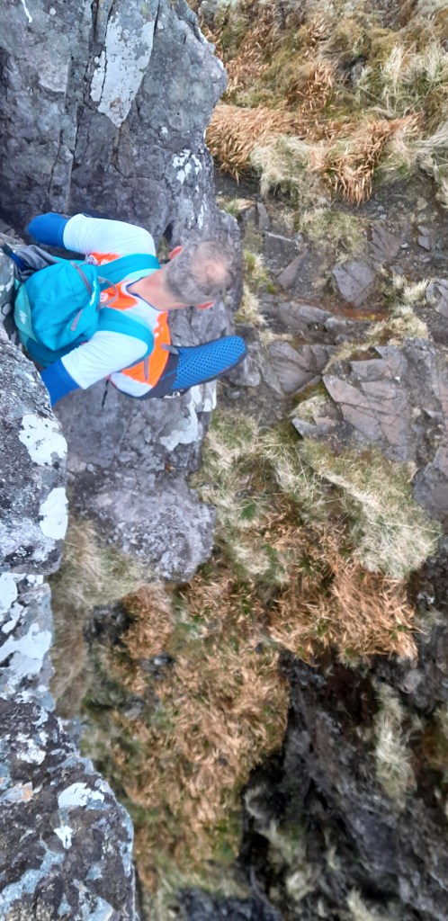 Ik heb geen expliciete rotsklimervaring. In het verleden volbracht ik bij de NKBV een C1-cursus sneeuw en ijs. Je leert daar goed te vertrouwen op je bergschoenen en stijgijzers. Je leert trittsicher te worden, in het Engels sure-footed. Ik denk dat dat het voornaamste is dat je hier in de Schotse Hooglanden gebruikt. Zowel Christian als ik hebben zware, technische trails gelopen in de bergen en kunnen zelfs in het meest technische terrein snelheid maken zonder de nek direct te breken.