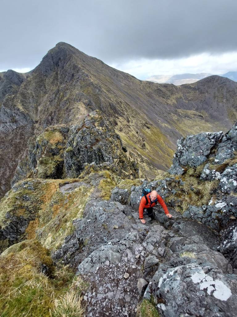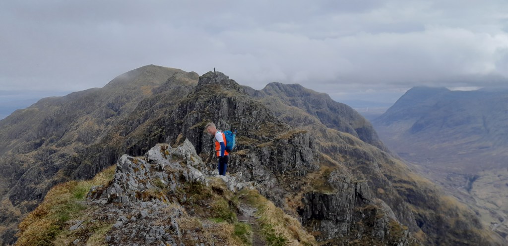 Ik merk dat ik daar niet mee bezig ben. Aanvallen! Voor ons strekt zich de graat uit, uitmondend in een topje, Stob Coire Leith. Daarna begint het echte klauteren. Mijn gidsje omschrijft het leuk: ‘Hard, exposed scrambling along the ridge between Am Bodach and Stob Coire Leith – experience and a good head for heights are required; some walkers may want to accompany a friend with rockclimbing skills and rope – or bring several pairs of spare pants! The very name of Aonach Eagach strikes fear into many hillwalkers, but others will relish the trilling and spectacular scrambling on the traverse of what is often claimed as the narrowest ridge on the mainland. The route links two Munros to make a day to be remembered long after the celebrations in the Clachaig Inn have died down…’