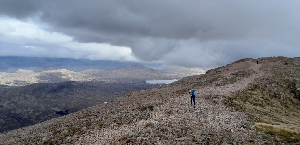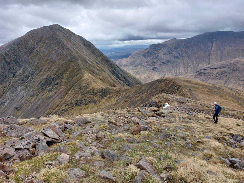 We dalen de berg af terug naar het zadel waar we omhoog kwamen. Dan volgt een tocht van vier kilometer over de ridge, over twee flinke toppen, naar de Ston na Broige die aan het andere uiteinde van de ridge ligt.