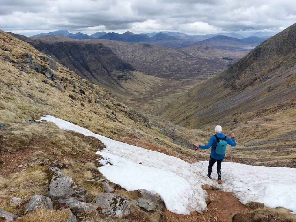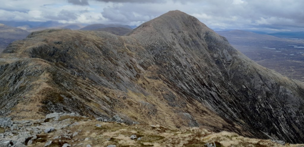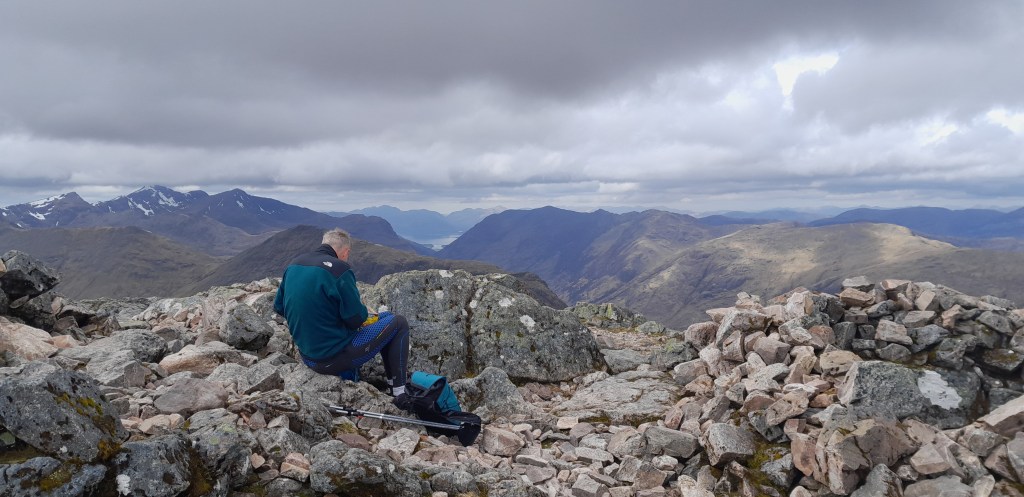 We zitten even en eten onze reepjes van BYE! Nutrition. Het uitzicht is fenomenaal. We zien de Ben Starav en drie omliggende Munro’s van gisteren, de Ben Nevis in de verte, daarvoor de Aonach Eagach-graat en weer verder de uitgestrekte heidevlakte Rannoch Moor. De wolken maken het alleen maar spectaculairder.