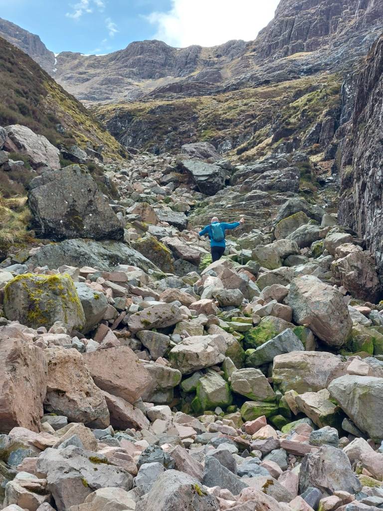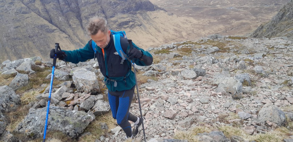 Wij hebben daar geen tijd voor en blaffen de berg op. Het pad gaat vrij snel over in een stenenveld, een couloir dat stijl omhoog loopt en waar de het water door naar beneden stroomt. Dit is de Coire na Tulaich, die bekend staat om de vele lawines in de winter waarbij veel slachtoffers vallen. Eigenlijk blijven we 600 hoogtemeters door deze stenenwoestenij omhoog klauteren. Het is een spel waar je de kop bij moet houden en dat maakt het niet onaangenaam. We winnen razendsnel hoogtemeters. Pas aan het eind van de klim belanden we in een puinveld waar werkelijk alles los zit en ook stenen van een halve meter onder je voeten meegeven en naar beneden glijden. Christian bezigt de illustere zinsnede: ‘De eerste beklimming waarbij je bij iedere kilometer klimmen, 400 meter naar beneden glijdt.’ Opeens snap je waarom veel mensen hier in de winter omkomen als gevolg van lawines. Maar ook in maart en april kwamen hier nog hikers om: https://www.dailyrecord.co.uk/news/scottish-news/climber-dies-after-horror-164ft-29698385?int_source=amp_continue_reading&int_medium=amp&int_campaign=continue_reading_button#amp-readmore-target