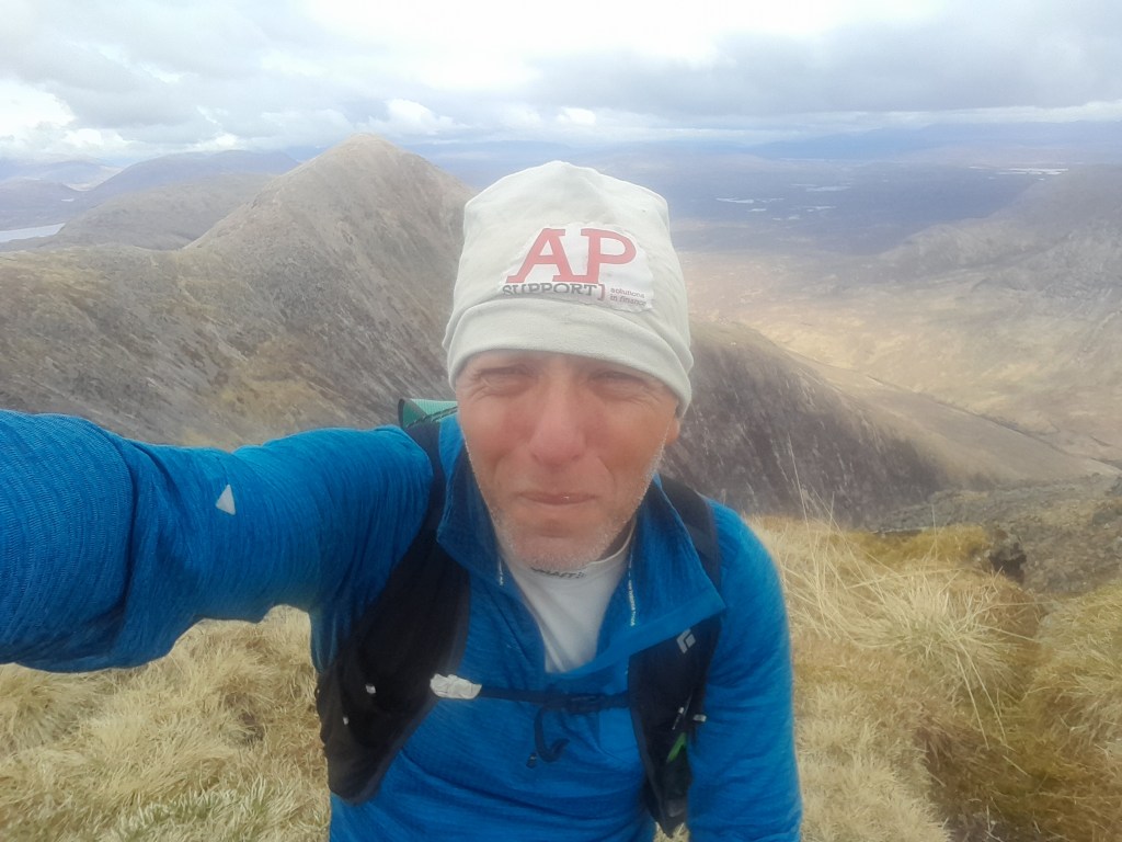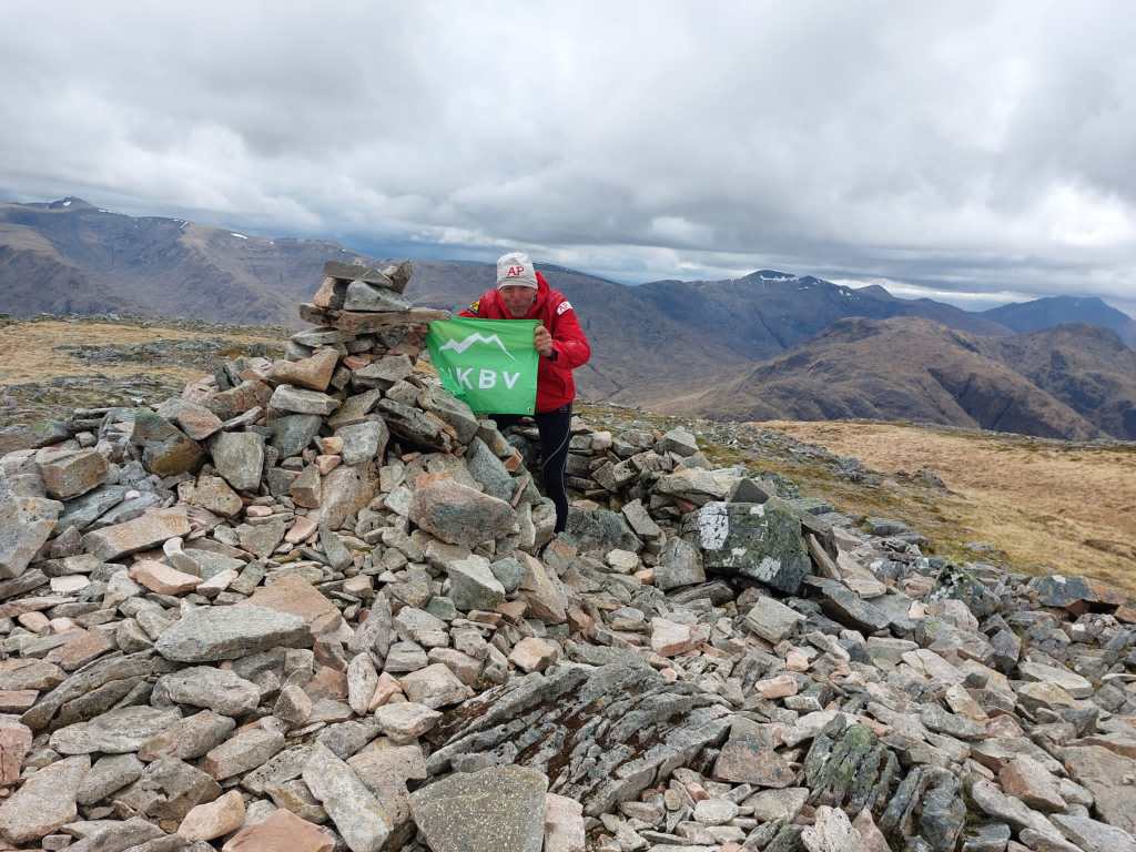 Christian is doorgerend dus ik zet de achtervolging in. We pakken de tweede tussentop en via een eenvoudige grasgraat rennen we probleemloos naar de tweede Munro. Deze is geadopteerd door Justine dus ook voor haar maak ik een videoboodschap.