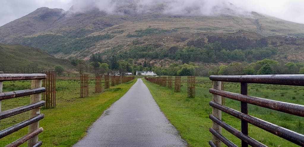 Als ik uit de auto ben, begint het te regenen. En dat blijft zo af en aan een beetje doorgaan. Via de Glenure Lodge werk ik me naar het begin van het bergpad. Gestaag klim ik het dal uit om eigenlijk in één lange rechte lijn naar de top te klimmen.