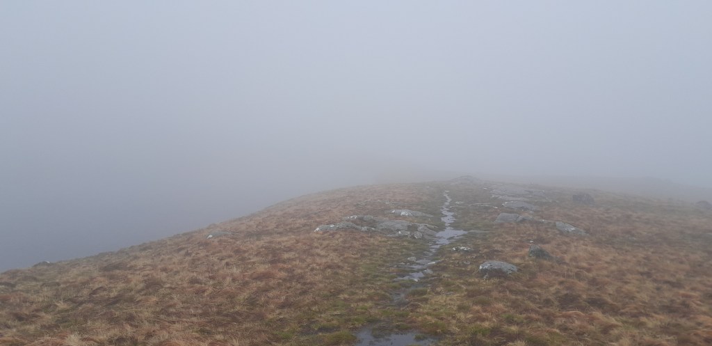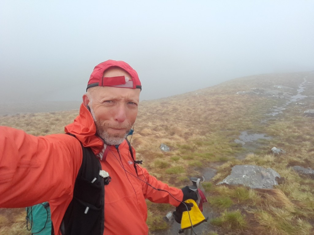 Het is doodvermoeiend en meer nog op de terugweg. Deze berg heeft alle vocht van de laatste dagen geabsorbeerd. De paden liggen niet op de graat maar eronder en dus een beetje scheef. Aldus glijd je met je Hoka’s die inmiddels alle profiel verloren hebben als een kreupele manke geit langs de wanden. De wind in je muil, kwijlslierten als draden langs je hoofd, hagelbuien in de ogen die als gevolg gaan tranen en dat eeuwige geklapper terwijl je focus moet houden om je voeten goed neer te zetten.