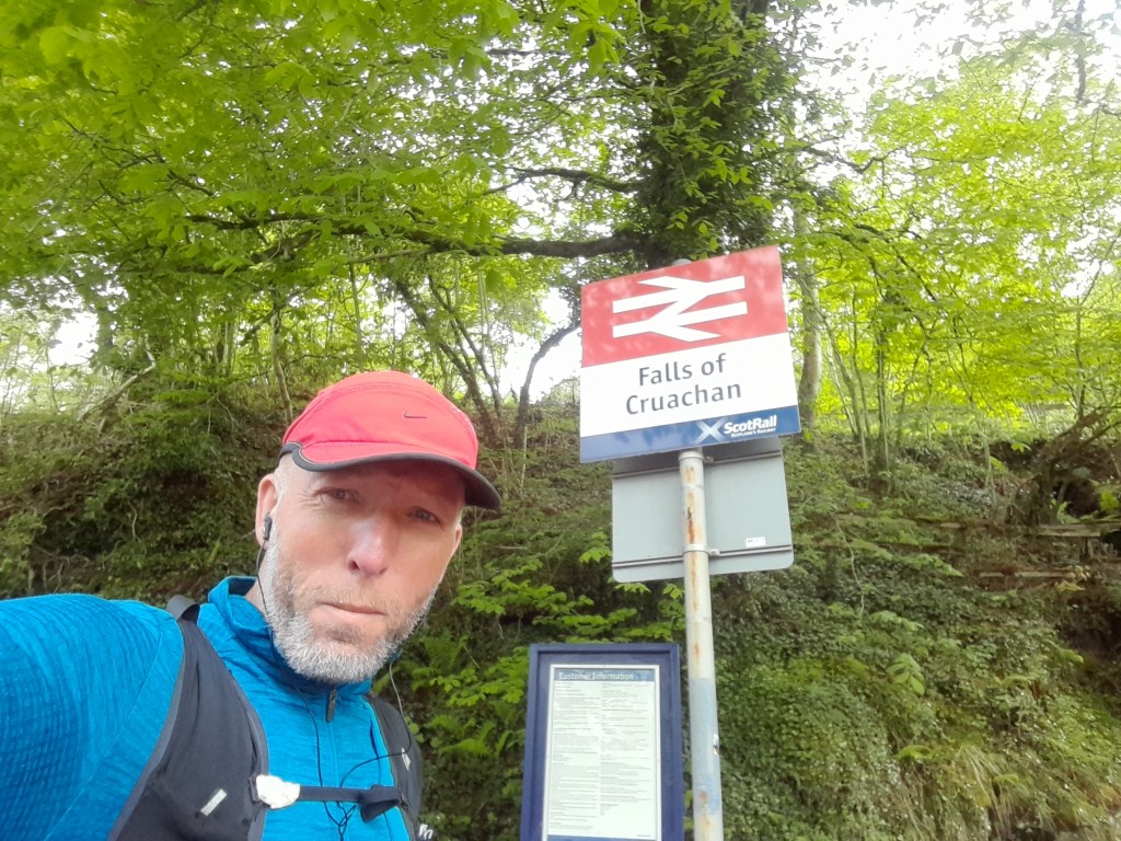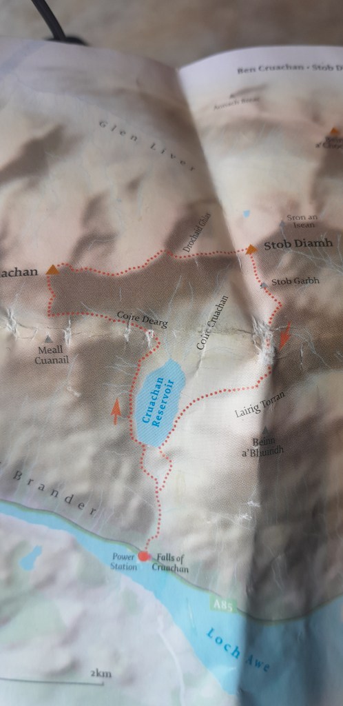 De Ben Cruachan loopt vanaf de dalweg meteen steil omhoog. Er loopt alleen de weg, zo lijkt, en je vraagt je af waar in hemelsnaam het pad omhoog loopt. Honderd meter van het visitor center blijkt echter net boven de weg een piepklein treinstationnetje te liggen. Via een steile trap loop je naar het spoor, opent een hek, om dan via een groezelige voetgangerstunneltje aan de andere zijde van het spoor te belanden waar direct de klim begint. Binnen tien minuten heb ik de eerste 200 hoogtemeters in de benen via een bijzonder steil paadje dat zich via technisch terrein omhoog baant. Je snapt meteen waarom hier een waterkrachtcentrale ligt. Tussen de twee Munro’s die ik vandaag beklim, ligt een bekken dat een stuwmeer vormt van waaruit een stroom water zich naar beneden perst, de Falls of Cruachan. Mijn paadje volgt dit watertje en dus de kortste weg naar boven.