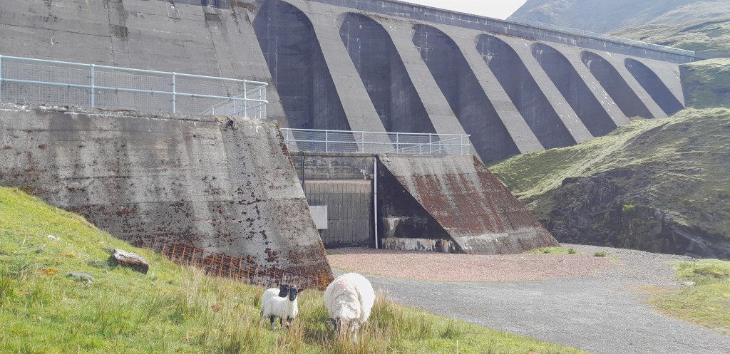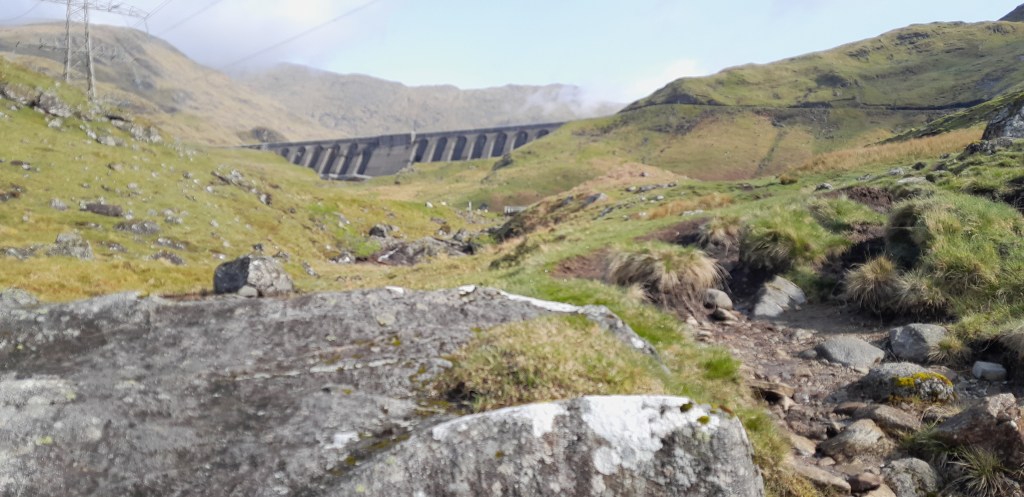Puffend haal ik een klimmer in die voor me vertrok. Het is Mark, een sympathieke kerel met een snor. We beppen even. Hij gaat via de ene kant van het stuwmeer omhoog en het rondje tegen de klok doen daar waar ik met de klok meega. Ik snel voor hem uit richting de Cruachan dam.