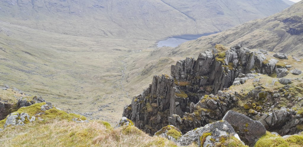 Als ik het meer bereik een blik omhoog. Ik ontwaar Mark op de topgraat 600 meter hoger, ook hij is zijn afdaling begonnen. Na vijf uur sta ik weer op de parkeerplaats en doe me tegoed aan twee blikjes Irn Bru en een bacon roll.