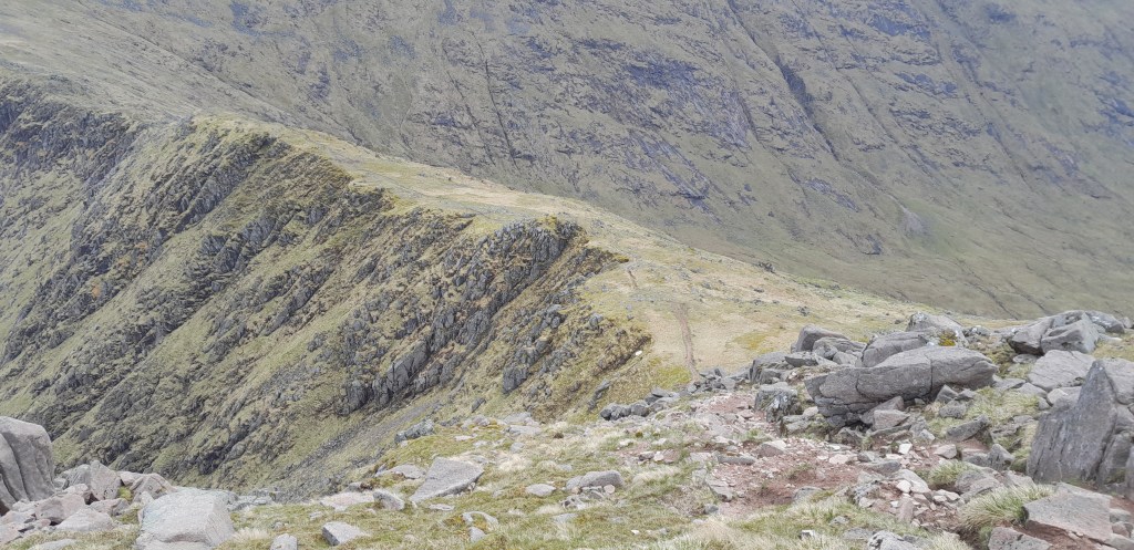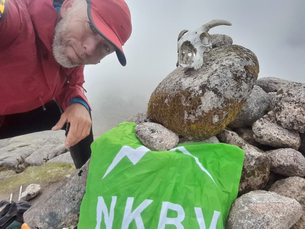 Vanaf het zadel volgt een steile klim van 200 meter via rotsvelden naar de top. Ik tref een cairn met daarop de schedel van een berggeit. Het past wel bij deze eigenzinnige berg. Sommige Munro’s zijn gewoon, kennen een grasrug en hebben geen eigenzinnige kenmerken. De Ben Cruachan daarentegen is een berg met karakter. Aan weerszijden zijn er prachtige graten met verschillende puntige topjes, vandaar ook zijn bijnaam hill of peaks. Het maakt dat de berg duidelijk te onderscheiden is vanaf alle omliggende bergen die ik inmiddels beklommen heb. De hoefijzervormige tocht van vandaag wordt gezien als één van de mooiste wandelingen van de zuidelijke Highlands.