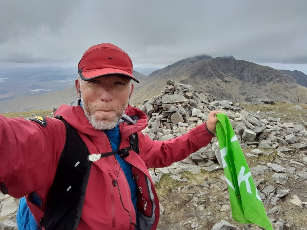 Naast de cairn staan de restanten van een trig point, een stenen paaltje met een uniek nummer dat de top markeert. Ik ga zitten om eens gewoon te genieten van de vergezichten en van mijn BYE!-reepjes te peuzelen. Dit is een van de eerste keren dat ik tijd neem, misschien omdat het de Munro met nummer 45, gecombineerd met de hoogte ergens een mijlpaal is. Dit is een bijzonder mooie berg en het is ook nog eens een prachtige dag. De wolken vliegen in pluizen langs mijn hoofd.