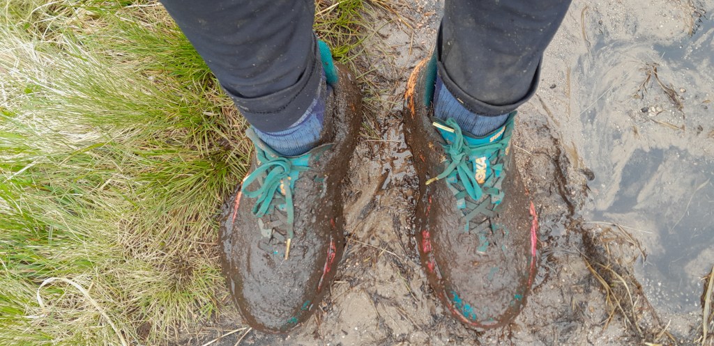Ik daal via de natte zompige graslanden en haal soms halsbrekende toeren uit om overeind te blijven. Het profiel onder mijn Hoka’s is helemaal opgesleten, stukken zool laten los en ook de binnenmesh heeft zijn beste tijd gehad. Mijn tenen worden in de afdaling helemaal verdrukt voorin de schoen en ze doen pijn. Als ik later schoenen en sokken uittrek zie ik ontstoken rode tenen. Ik heb geen blaren maar door het eeuwige rennen met natte voeten is de huid helemaal weggesleten, alsof de tenen met een aardappelschilmesje dun geschild zijn.