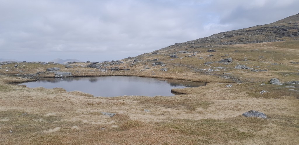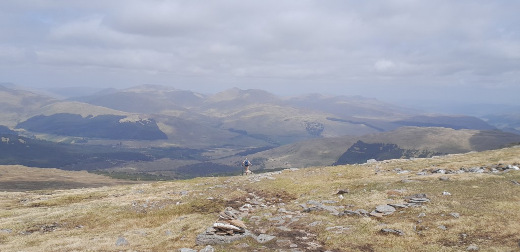 Vanuit het zadel volgt een eenvoudig klimmetje naar de eerste Munro van vandaag, de Beinn Dubhchraig. Op de top kan ik de hele graat overzien die ik moet volgen naar de top van de Ben Oss. Het is heiig dus de vergezichten zijn er wel, maar vaag.