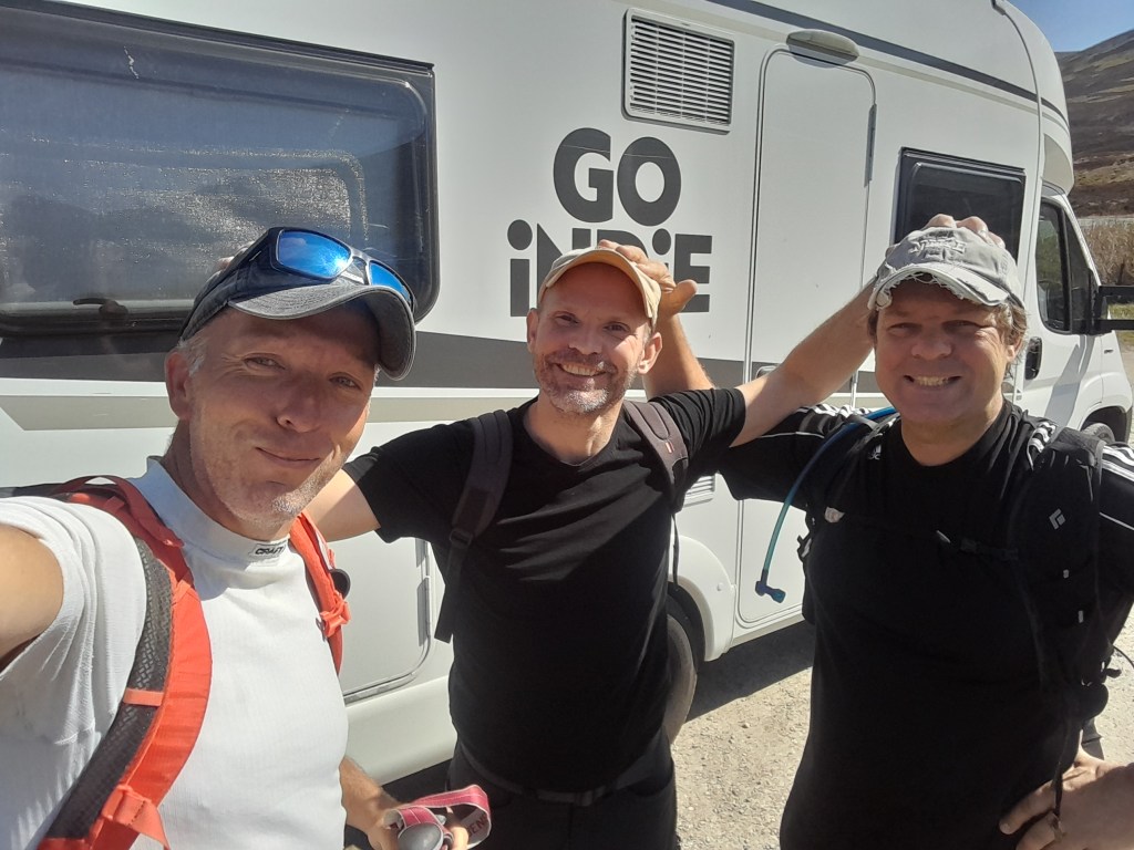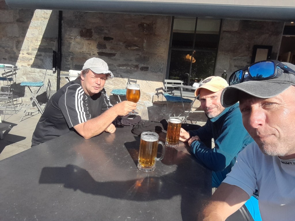 Marcel is vooruitgesneld en heeft stoeltjes klaargezet. Een ketel water staat op dus niet veel later zitten Marcel alias Smeagol, Erik alias Oubidoubi en ik met al mijn bijnamen naast de camper een bak koffie te drinken. We genieten weer van onze masculine torso’s en fenomenale prestaties. Goed dat het klaar is. We zijn geroosterd in de onvergeeflijke Schotse hitte. Tijd voor een biertje op het terras.