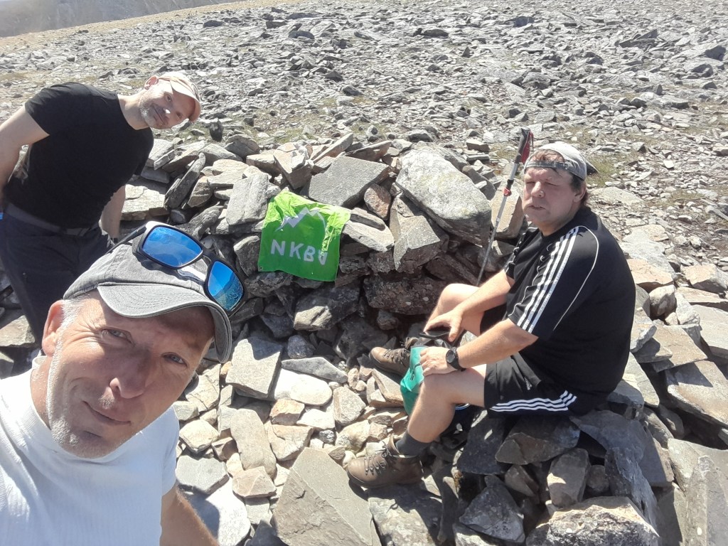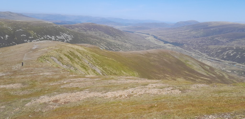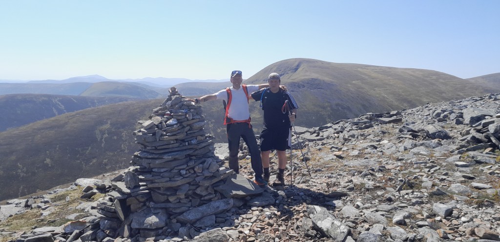 De aanloop is gestaag door heide. Eens een keer geen natte voeten. Een strakblauwe hemel en het is ronduit heet. De heren De Bakker vallen met neuzen in boter. De top is een uitgestrekte grasrug met een cairn en we kijken uit over de Cairngorms en het prachtige Loch Ericht dat zich onder ons uitstrekt.
