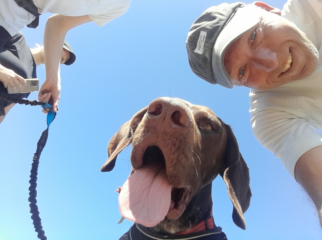 Er volgt een ontspannen afdaling van 200 meter naar de vallei voor onze tweede klim. Hier gaat bij mij het gas open. Ik stoom de berg op, dump de rugzak op de kam en jaag rechtsaf over de kam naar mijn tweede top van de dag. Het is ongeveer vier kilometer heen en ik kan blijven rennen. Op de top twee meiden met een blaffende hond die bijzonder aanhankelijk blijkt en om een selfie vraagt.
