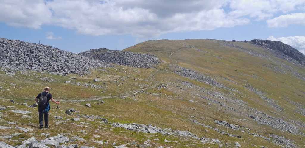 We werken vandaag vakkundig het hele hoefijzer af met enkele subtoppen en andersoortige toppen die zich geen Munro mogen noemen. We delen de berg met eerder genoemde vier en nog vier anderen. Rustig voor een bloedhete zondag.
