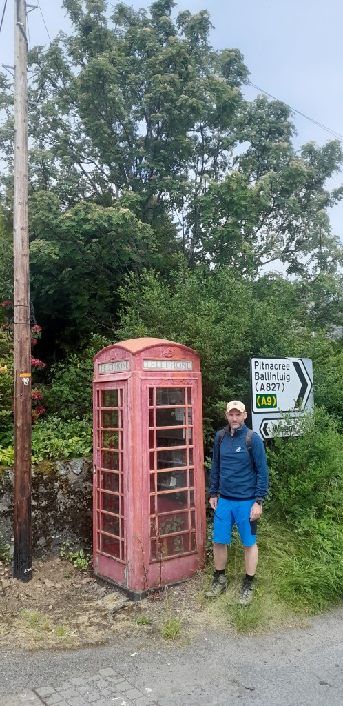 We steken eerst de brug over in Grandtully en hebben prachtig zicht op de rivier waar een aantal kayakkers aan het trainen zijn op de stroomversnellingen. Via het dorp komen we bij een klassieke rode telefooncel waar ons paadje begint. Er staan meteen doodswaarschuwingen. We steken de golfcourse over en je kan een balletje voor je kop krijgen, ofwel maak je aanwezigheid kenbaar.