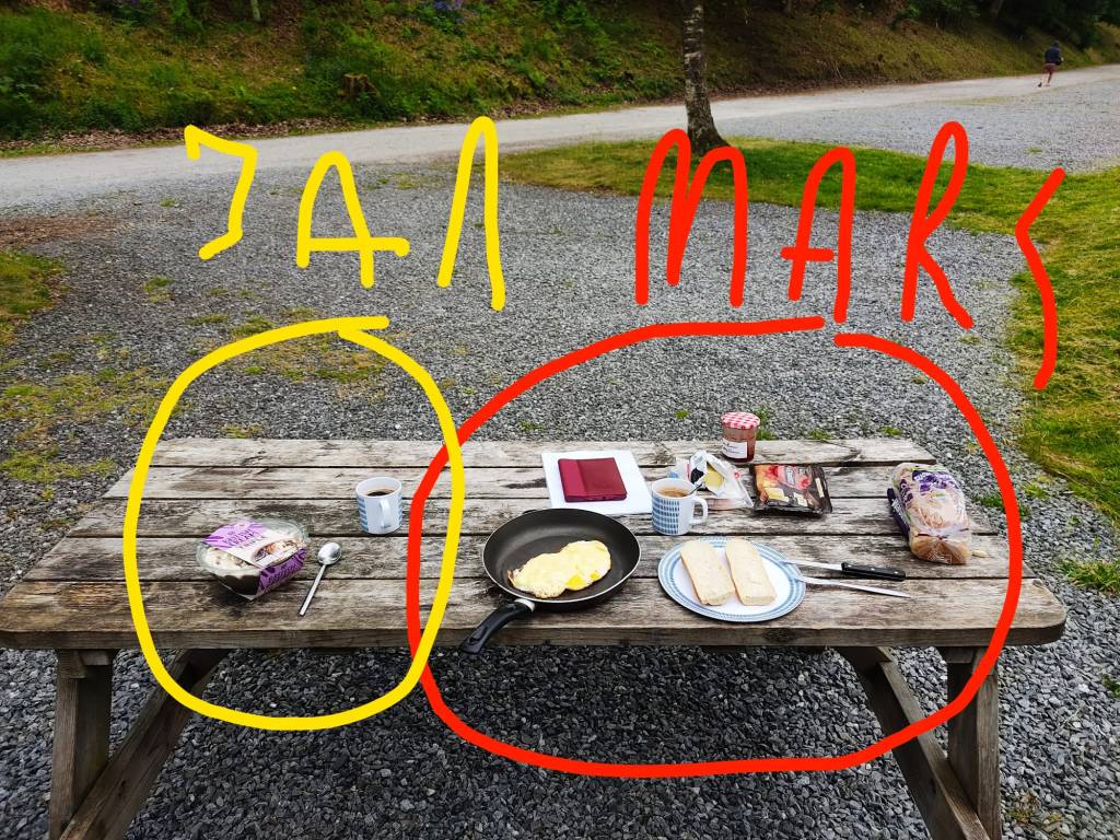 Dat terzijde. We starten de dag met ons typerende ontbijtjes. Een Ferrari ontbijt met gebakken eitjes met kaas, meergranenbrood, vitaminepillen en fruit. Een Pantsermaus VIII eet een aardbeientrifle van 1.300 kilocalorieën. Met koffie. Veel koffie.