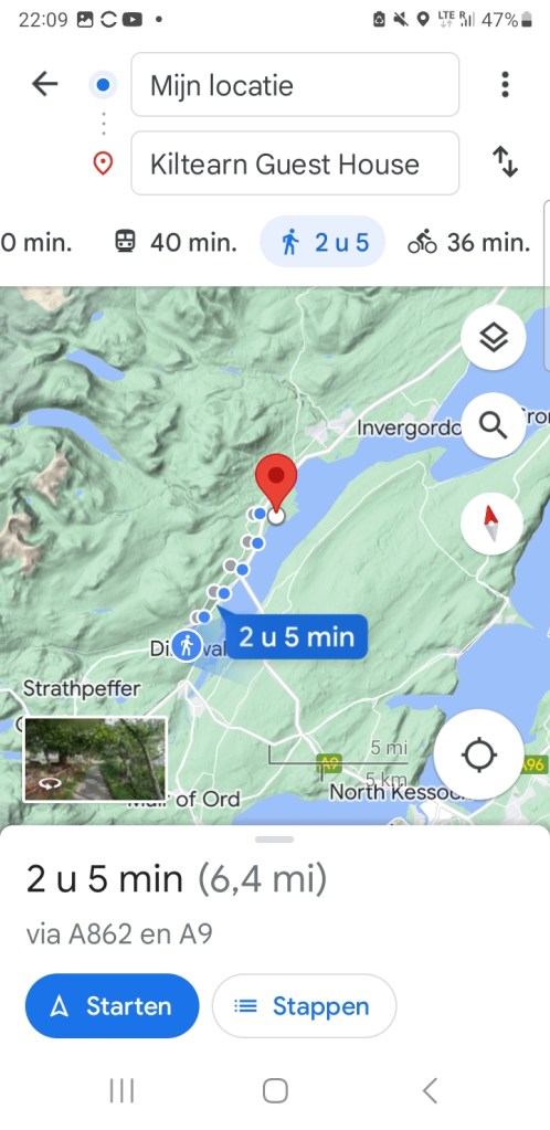 Sara moet naar Maryburgh, weer vijf mijl verder. Bijzonder dat een dame van haar leeftijd en kale vent meeneemt in de avondschemering. Uiteindelijk brengt ze me nog verder naar Dingwall want ze moet daar tanken en zet me af bij de bushalte.