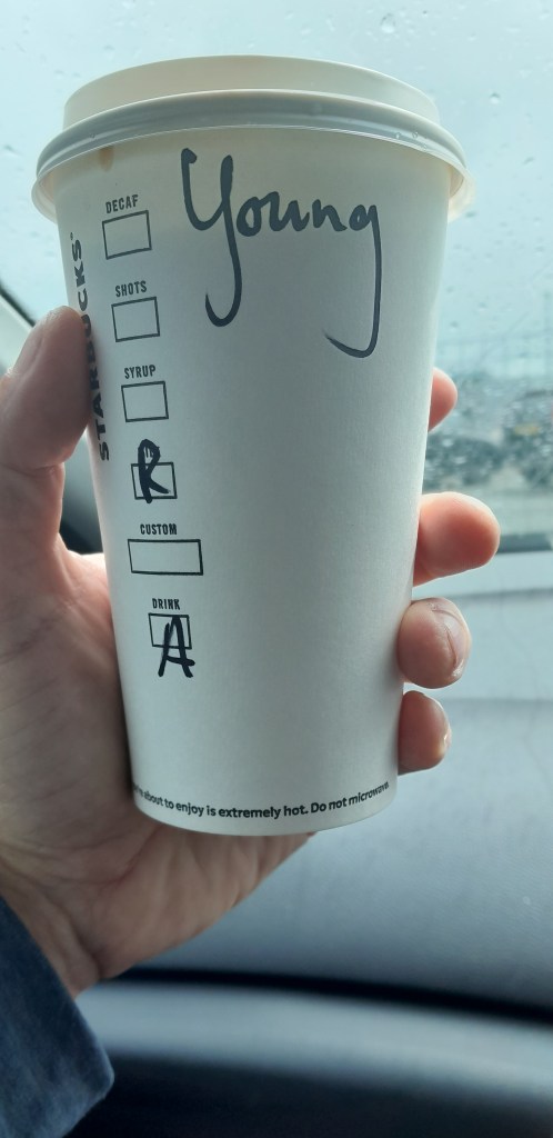 Starbucks. Ook hier is één woord voldoende en weet je genoeg. Dat is die toko waar je niet één maar twee keer in de rij staat voor je koffie, eerst om te betalen dan omdat het niet opschiet met alle grande, venti, large, megalomano en andere maten. Normaal geef ik de naam Theodoor Archibald door voor op de mok, nu maar gewoon Jan. Ze maken er Young van, de schatten. Ook Kate kan erom lachen en maakt een foto.