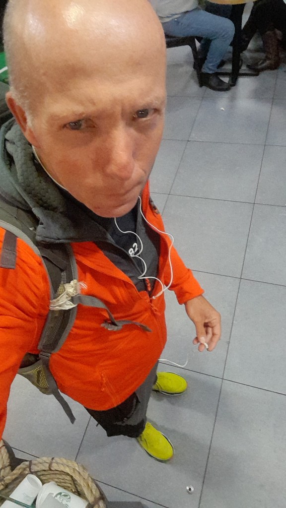 Na een korte sprint van deze hardloper inclusief een inhaalactie van de volledige rij bij de douane stond deze jongen na landen van de trein 20 minuten later ingecheckt, betast en hijgend bij de gate waar het boarden reeds begonnen was. Tijd voor ontspanning, waar is de koffie?