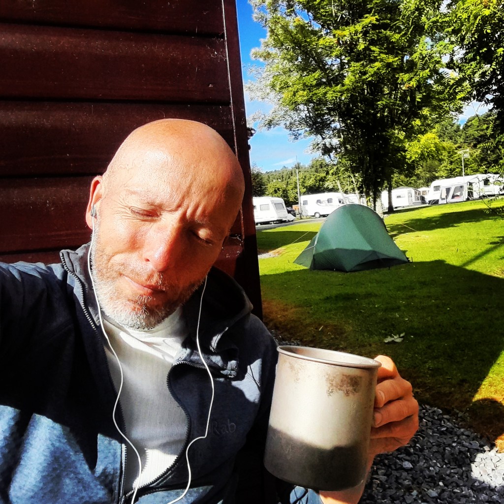 Ik slenter door en zet de tent op het Grantown on Spey Caravan Park. Ik krijg een prachtig plekje achter de receptie waar het gras niet om te soppen is. De powerbank mag een nachtje laden bij de receptie. Tijd voor een filmpje op Netflix.