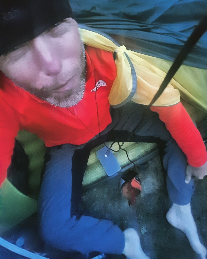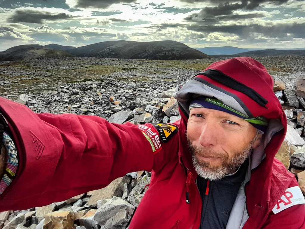 Het Cairngorms-plateau is uitgestrekt en lijkt oneindig. Het ademt eeuwigheid alsof de tand des tijds er geen vat op heeft. Het ligt er al miljoenen jaren onveranderlijk. In mijn fluorescerende rode regenjas, op mijn felgekleurde Hoka’s heb ik het gevoel dat ik hier niet hoor. Het voelt alsof ik hier in mijn eentje in overtreding ben. Ik word tijdelijk getolereerd in deze arena maar ben overgeleverd aan de loodgrijze wolken doe boos op me neerkijken en die ieder moment op me neer kunnen dalen om me op te slokken.
