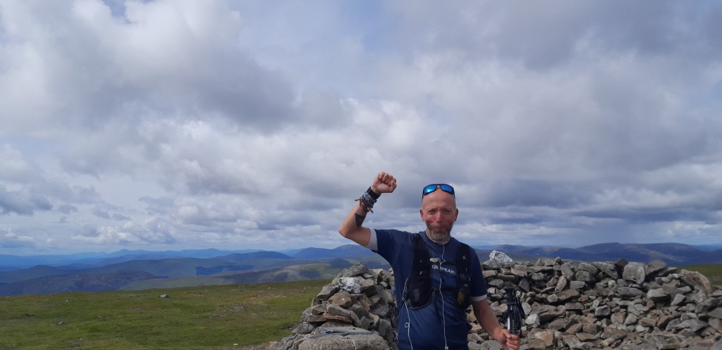 Deze Munro, de Tom Buidhe, is een speciale omdat het de 100e is. Even een lichte brok in mijn keel na weken toppensnellen. Veel toppen gehad, een heel land gezien, zoveel mooie mensen op mijn pad, alle weeromstandigheden en… nog zoveel toppen te gaan. Soms lijkt het allemaal zo onoverbrugbaar groots. Tegelijk zat ik vorige week op 90 en tik vandaag 102 aan. Het zijn echter allemaal grote, zware dagen gecombineerd met liften en dat vraagt veel van lijf en leden. Ik draag de top op aan mijn twee lieve neefjes die nog zo lekker kind mogen zijn en spelen-zonder-zorgen.