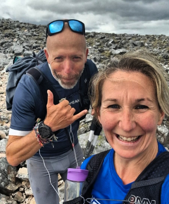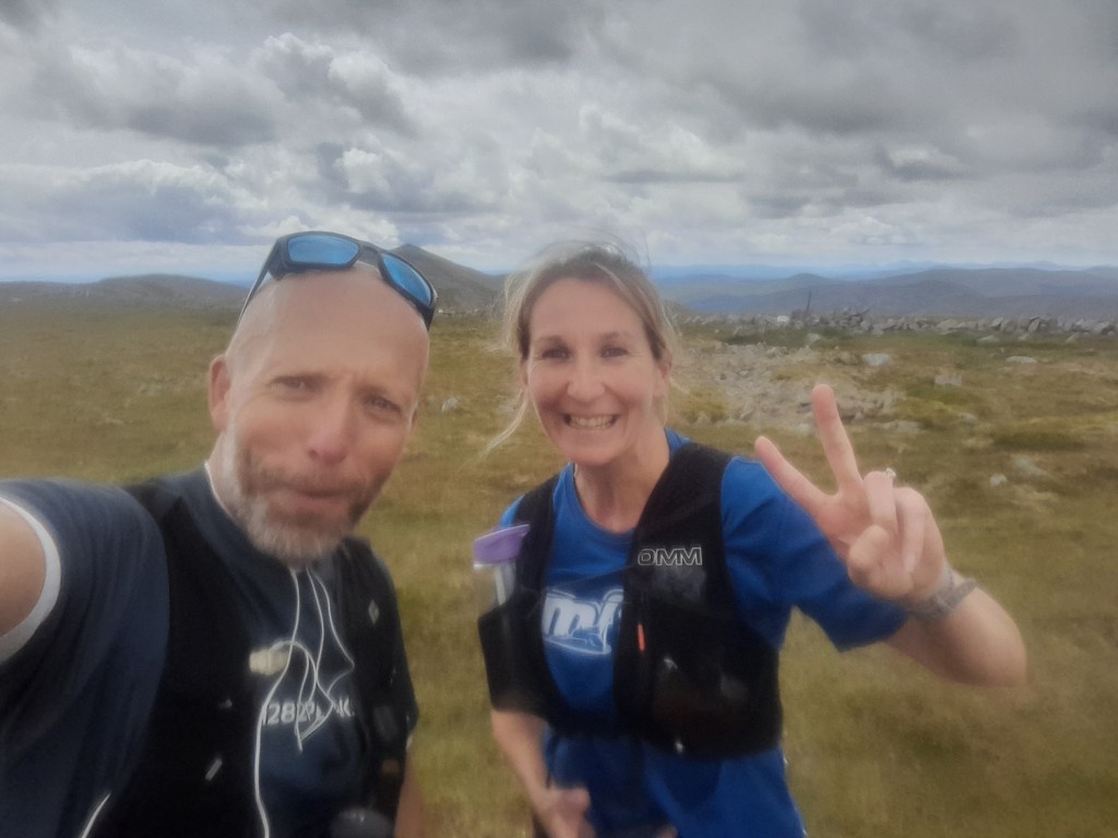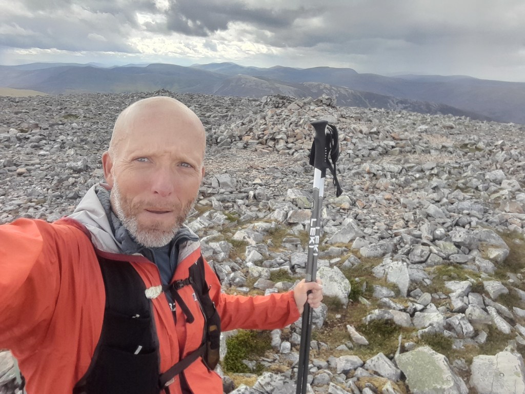 Ik ben blij met het gezelschap van Diane. Ze rent met me terug van deze top naar de eerste Munro en is een bruisende verschijning vol positieve energie en dat terwijl zij haar ronde er al op heeft zitten. Ze blijkt tien jaar jonger, zou dat het zijn? Door ons keuvelen, vliegt het heen-en-weertje waar ik nooit zo goed in ben, snel onder me door. Met een selfie nemen we afscheid.