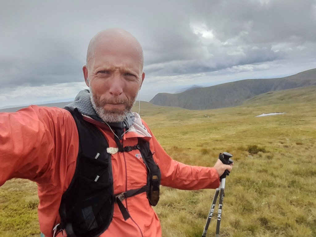 Niet te lang sta ik stil. Ik wil nummer vier aftikken en dan terug richting beschaving. Ik zoek geen pad maar laat me in een rechte lijn van de berg afvallen richting dalletje om meteen in volle galop tegen de Tolmount op te knallen. Inmiddels overal om me heen grijszwarte sluiers en dreigend onweer. Het begint weer te spetteren als ik de top heb gehad. Ik kan echter niet meer. Ik moet even zitten, adem pakken en eten en drinken. Ik maak een kort filmpje voor de fijne boys van BYE! Nutrition die me steunen met hun shots van Magnesium en elektrolyten en sportrepen. Na een reep en een shot hijs ik me omhoog.