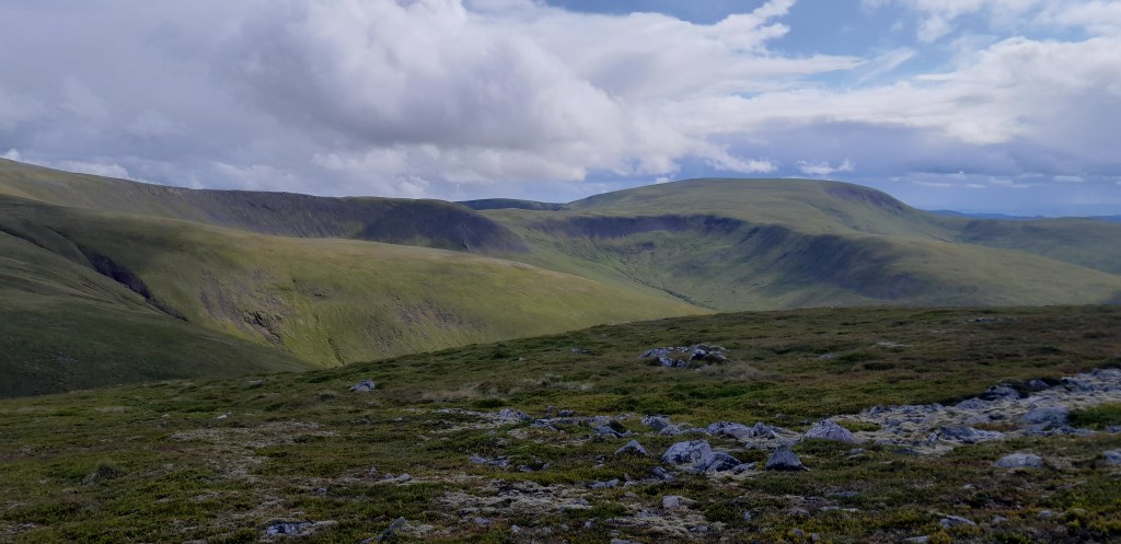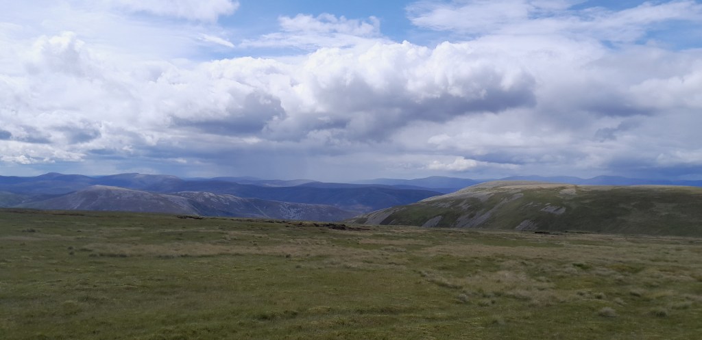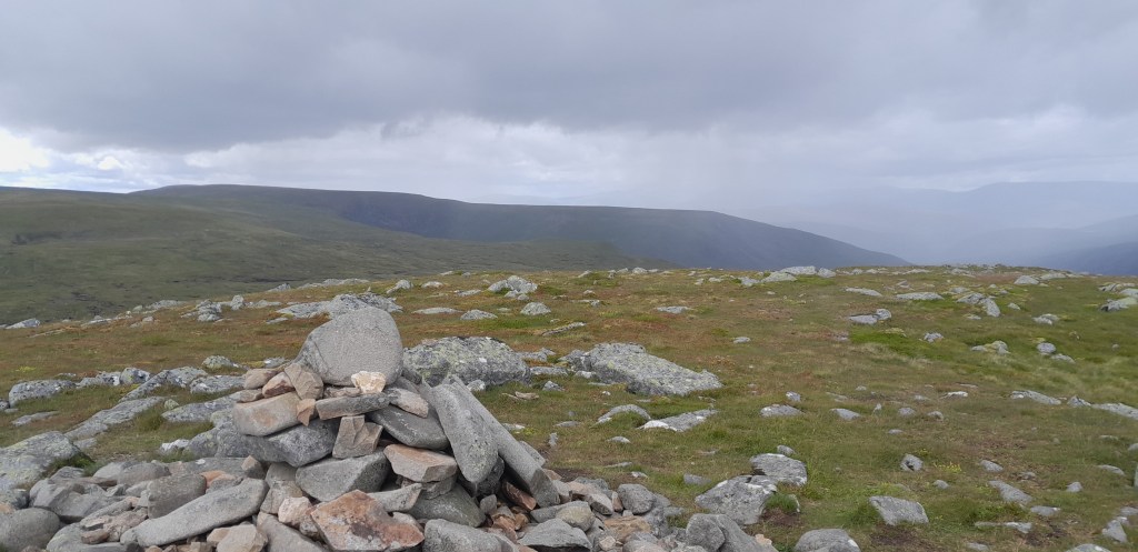 Ik passeer de eerste top op weg naar de derde. Een regenbui, de zoveelste van velen. Het is de dag van jasje-aan-jasje-uit. Door de heide hobbel ik in een kompasstand – who needs trails – naar het zadel. De derde Munro torent boven me uit, maar zoals zo vaak blijkt het allemaal minder erg als je dichterbij komt. Ik wil voor de top afbuigen naar het oosten om daar eerst twee afgelegen toppen af te tikken maar hoe ik ook zoek, ik vind niet het pad dat op mijn app staat.